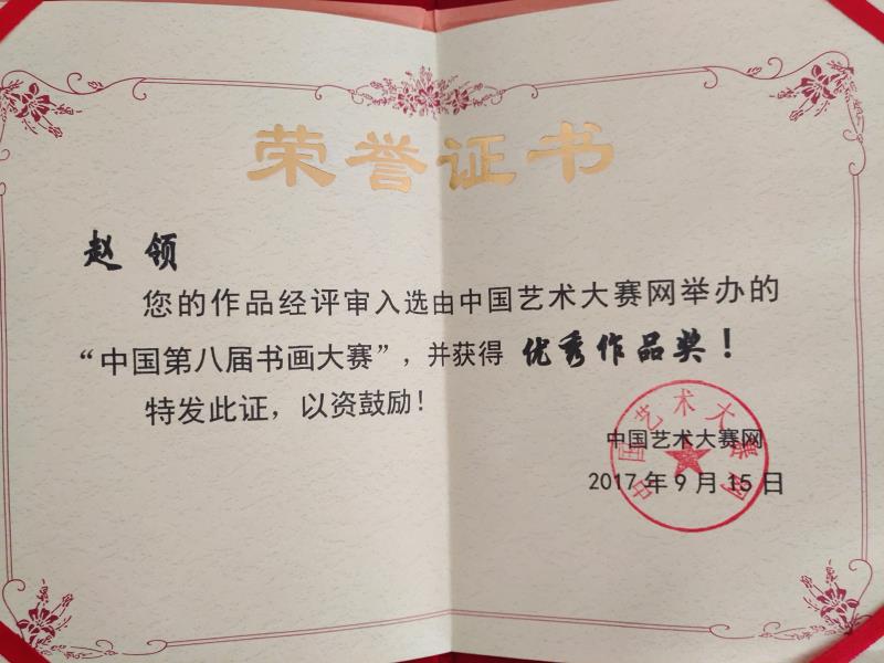 ●赵领。男,1974年出生于安徽庄子故里。字,三峰;号,醉墨先生、半坡草人、云墨轩主、独孤墨客。现师承王卫军先生。自幼酷爱书法,军旅中自修书法基础教程和江鸟书法且得多位军中书法前辈指点。他将能收集到的一切杂志和书籍,全部收集,并借用现代汉语大词典,一字字记录,一句句阅读,一篇篇理解;同时,借用板报、宣传画、刻字蜡印等一切机会,习字、求学。截止目前,中国的繁体字,除了做此专业研究的人员以外,估计很少有人像他那样认识得这么全这么多,理解得那么透的。几度春秋,一千多个日日夜夜,思想上、脑海中从来没有丝毫懈怠过弥补知识的匮乏,书法艺术的攀登与探求。虽然,一路上跌跌撞撞,甚至举步维艰,但依然不改初衷,自得其乐。转瞬,现役期满,退伍返乡。回家时,除了必须的装备以外,他啥行李也没有,楞是扛回了一麻袋曾经看过读过学习过的书籍。报读无锡《中国第一书画进修学院》书法艺术专业函授和面授及幸得第一恩师陈凌陀亲传和赵朴初老师斧正。涉帖广泛、博采众长,数十年的沉淀、积累、探索与求知,今尤为擅长行草书体,章草味烈二王韵足,洒脱超然、风格独特。近年来该作品被诸多行业人士收购收藏,其中多幅作品被日本和英国相关人士永久收藏。曾于2012年7月应邀日本大阪举办个人佳作展。后得周鉴明、欧新中、潘会军、谢道佑、秦建、陈洪等数位良师益友交流、学习,不断自我提升。作品获奖为庆祝香港回归书画大赛优秀奖;庆祝长征胜利七十周年全国书画大赛银奖,入编《当代华夏书画艺术家珍品藏典》,获“德才兼备书画艺术家”光荣称号;第二届“欧阳询奖”全国书法大赛银奖,入编《中国当代知名书法家墨迹选》,获“德艺双馨书法艺术人才”光荣称号;“中国梦●一带一路”百名书画名家大赛铜奖等诸多奖项。安徽三子文化有限公司、云墨轩、领艺书画、蒙城唯一《文化部艺术发展中心全国美术考级定点机构》创始人。现为中国书画家协会会员、湘潭市书协会员、海南省青年书法家协会会员、中国老年书画家协会会员、蒙城县硬笔书法协会理事、蒙城县书法协会副主席、亳州市美术家协会会员、海南省徽韵书画院副院长、世界华人艺术家协会会员、中国国际书画艺术家协会会员、一级书法师、 中国当代最具投资收藏价值的实力派书法家等。