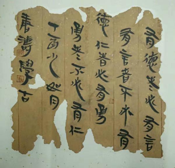宿州人,幼从家学,以颜楷入手。及长,于诸体均有研习。近十年致力于秦汉简帛书体的探索,对马王堆简帛、银雀山汉简、里耶秦简等做过静心的梳理,逐步形成宽博典雅、质朴高古的书风。曾问道于当代简帛大家毛国典、鲍贤伦先生,获两位先生高度赞评。
