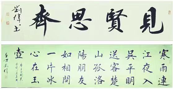 其字结体精严,清朗挺拔,布势轻重相宜,主宾相济,风神俊秀,具有鲜明的个性特点,给人自然、端庄、秀润、挺拔、劲健、舒展之美感。这种和谐之美既是刘伟平和的心态以及他“做人端庄诚信和善”原则的体现,更是中国传统文化“和为贵”理念在书法中的体现。