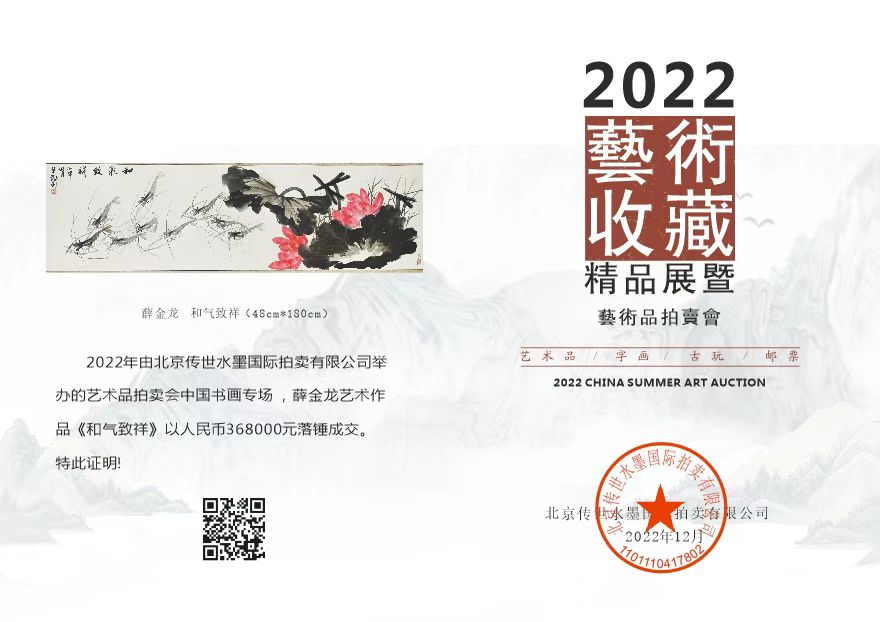 2022年作品《和气致祥》在北京传世水墨国际拍卖有限公司举办的艺术品拍卖会中国书画专场,最终以368000元成交。