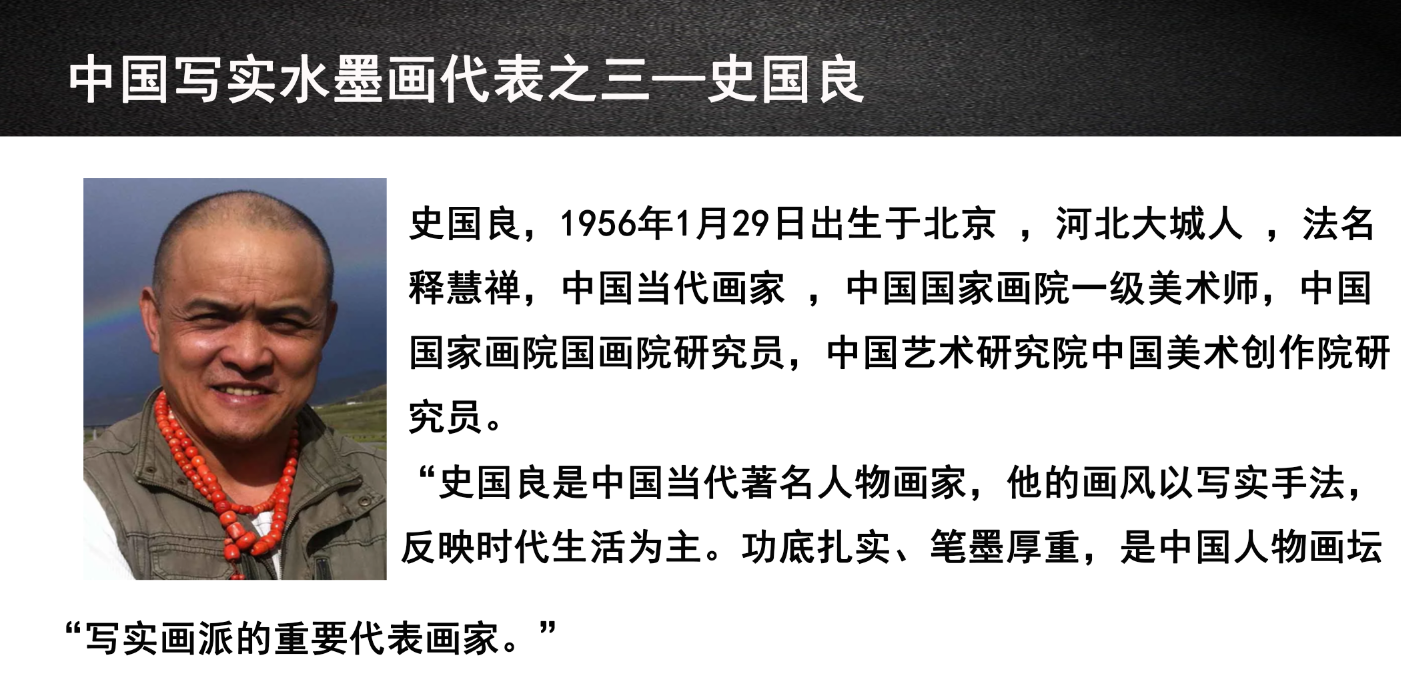 史国良主张形式、技巧于中国人物画来讲无异于文学创作中的炼词造句,而关健是要利用这些词汇写文章,中国人物画的形式、技巧可以多种多样,这不在于继承和发掘古人留下的技法与趣韵,也不在于把西方绘画中的解剖、结构、光影、构图如何与水墨巧妙地结合,而是要建立自己的思想体系和文化结构,找准自己的立足点和前进方位,因此,在国良的画作中,笔墨厚重,酣畅,画面层次分明,进深感强烈,色彩凝重富有装饰的意味,在坚定地保持着中国传统笔墨的同时,揉进了更多的西方绘画的造型技法。