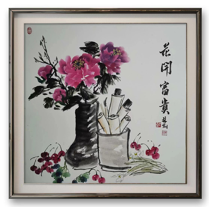 2023年9月 受邀参加福州吉祥书画院乔迁喜笔会,花鸟画《花开富贵》68*68cm被福建省委办公厅郑主任夫人收藏。