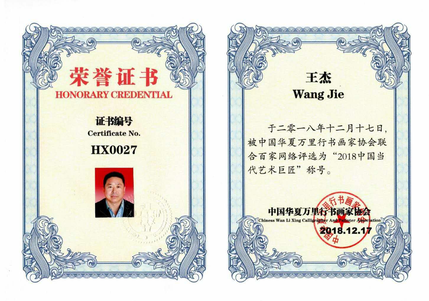 2018年12月 ,王杰被中国华夏万里行书画家协会联合百家网络被评为“2018中国当代艺术巨匠”的称号。