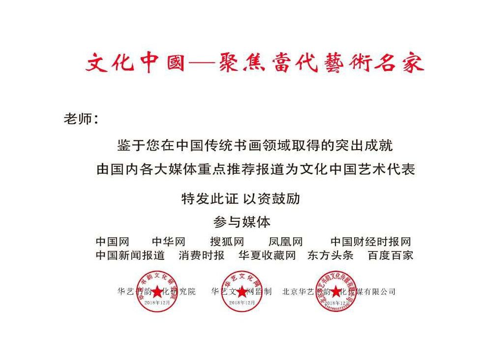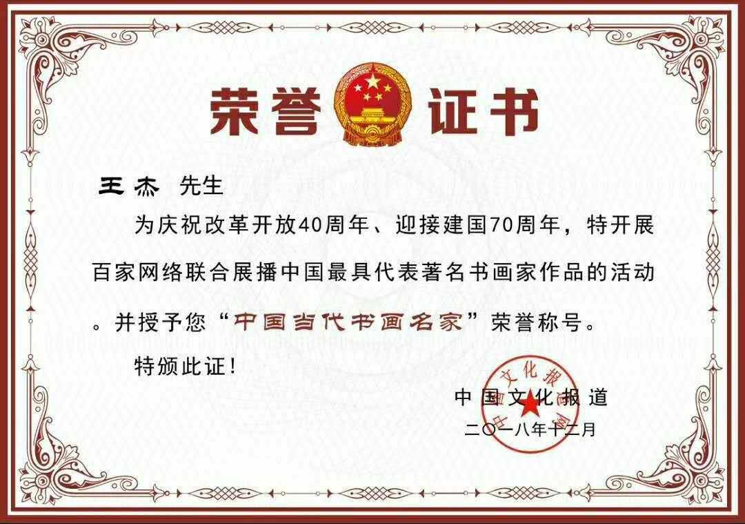 2018年12月为庆祝改革开放40周年,迎接建国70周年,中国文化报道,中国文化报道网特开展百家网络联合展播中国最具代表著名书画家作品的活动。并授予王杰为“中国当代书画名家”的荣誉称号。