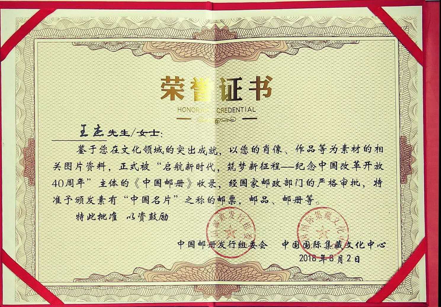 2018年 8月2日鉴于王杰在文化领域的突出成绩,在中国邮政庆祝中国改革开放四十周年的活动中作品被征用,作品图片作为邮票图案印在邮票上,文化部备案以国家名片的形式进行展示,全国限量出版发行《起航新时代,筑梦新征程》邮册。