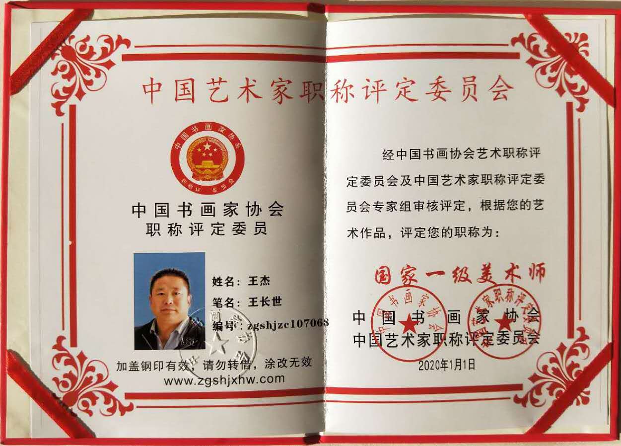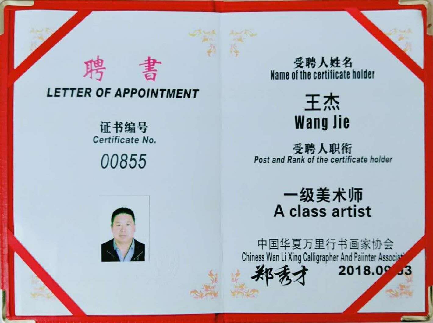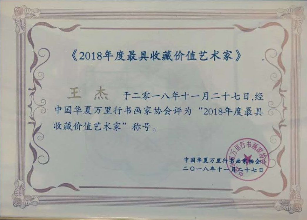 2018年11月21日 ,经中国华夏万里行书画家协会评选王杰被评为“2018年度最具收藏价值的艺术家”称号。