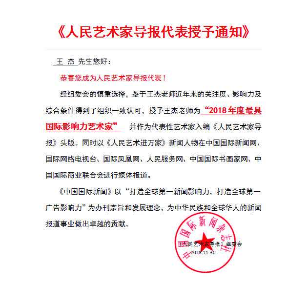 2018年11月29日他的绘画作品经中国国际新闻杂志社严格评选之后,被中国国际新闻杂志社等六大国际媒体评为:“人民的艺术家”和“国际上最有影响力的艺术家”的荣誉称号,同时中国国际新闻《人民艺术家导报》头板专门刊登了他的作品;出版《中国当代书画名家》。(中国书协主席苏士澍和王杰作品合集);《文化中国----聚焦当代艺术名家》(中国美协主席何家英和王杰合刊);