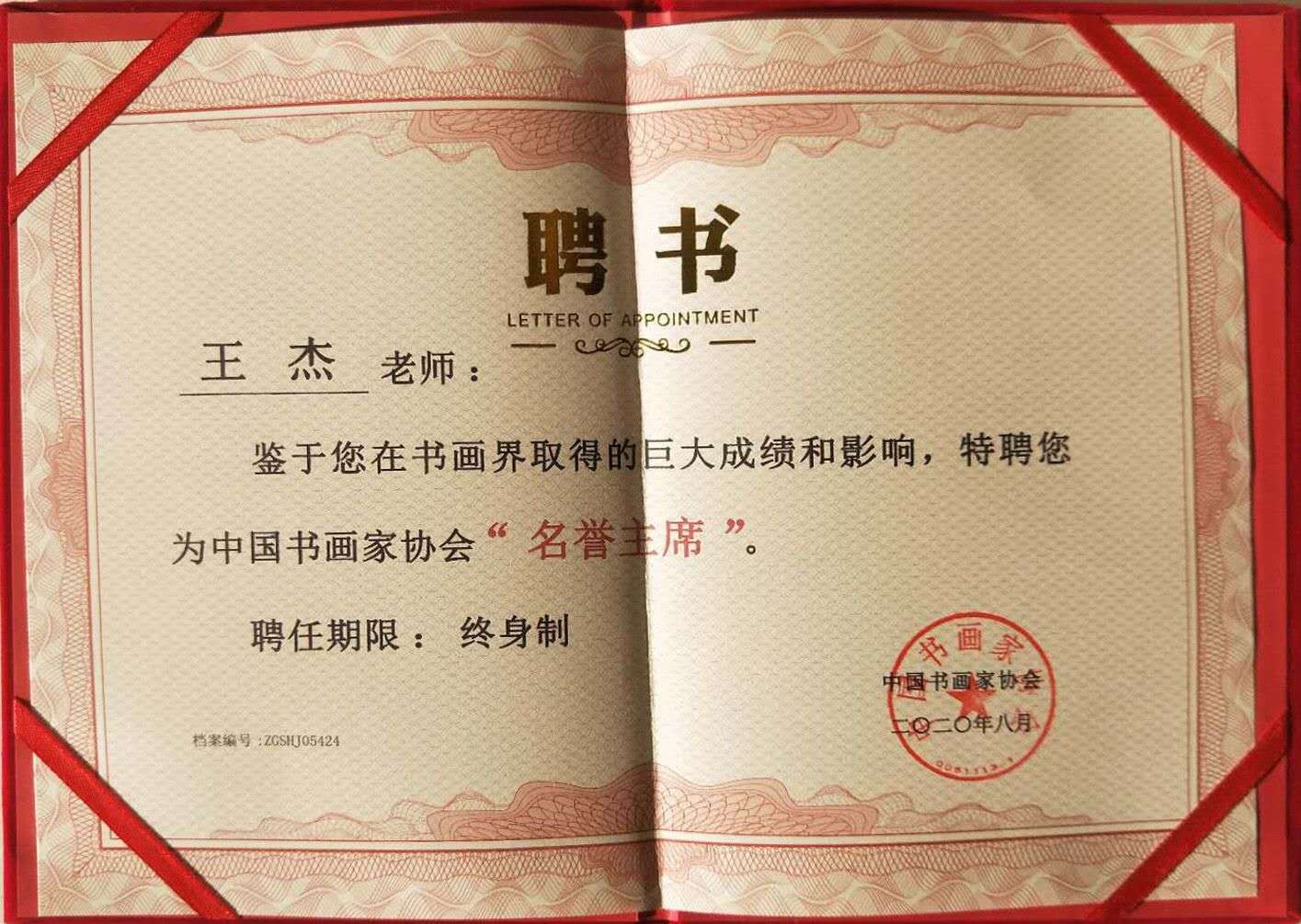 2020年8月中国书画家协会聘请王杰担任中国书画家协会名誉主席。