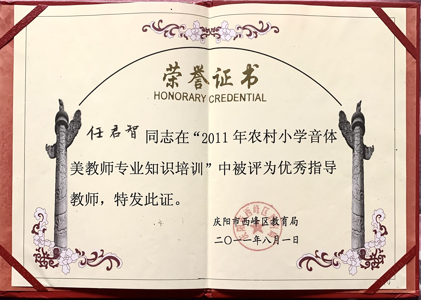 2011年在农村小学音体美教师专业知识培训中获优秀指导教师;