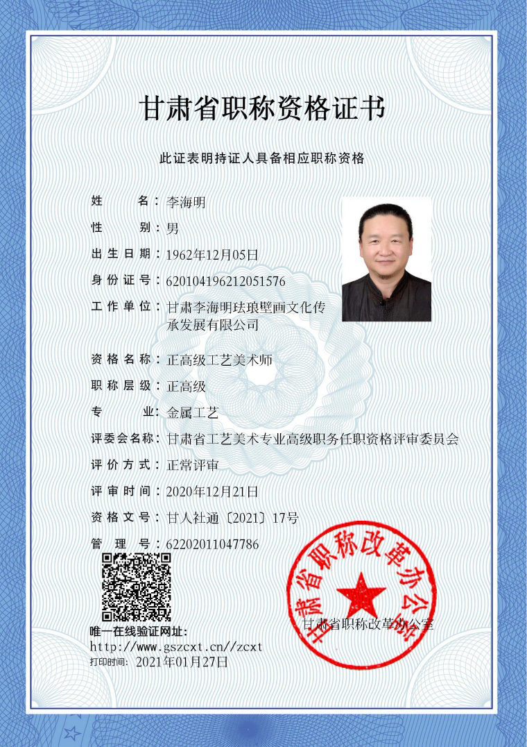 李海明1962年出生于革命家庭,自幼好学,8岁就随伯父学习景泰蓝的制作工艺,并开始系统的学习绘画和工笔画。在珐琅画的传承、发展和创新上,甘肃代表性传承人李海明将刺绣、国画、漆画甚至刻葫芦等艺术形式中的技法和色彩融汇贯通到珐琅艺术中,并注入了堆丝、垒丝等高难度的镶嵌技艺,使珐琅艺术呈现出更加大气、精湛、细腻、厚重的视觉震撼力,展示其独特魅力以及手工艺的精妙之趣。掐丝珐琅制作工艺繁杂,因此,具有很高的收藏价值、艺术价值及欣赏价值。