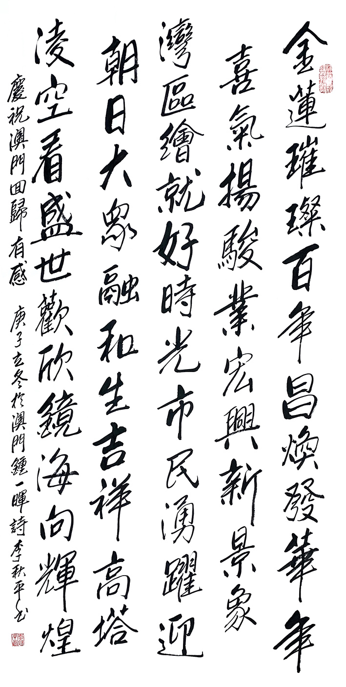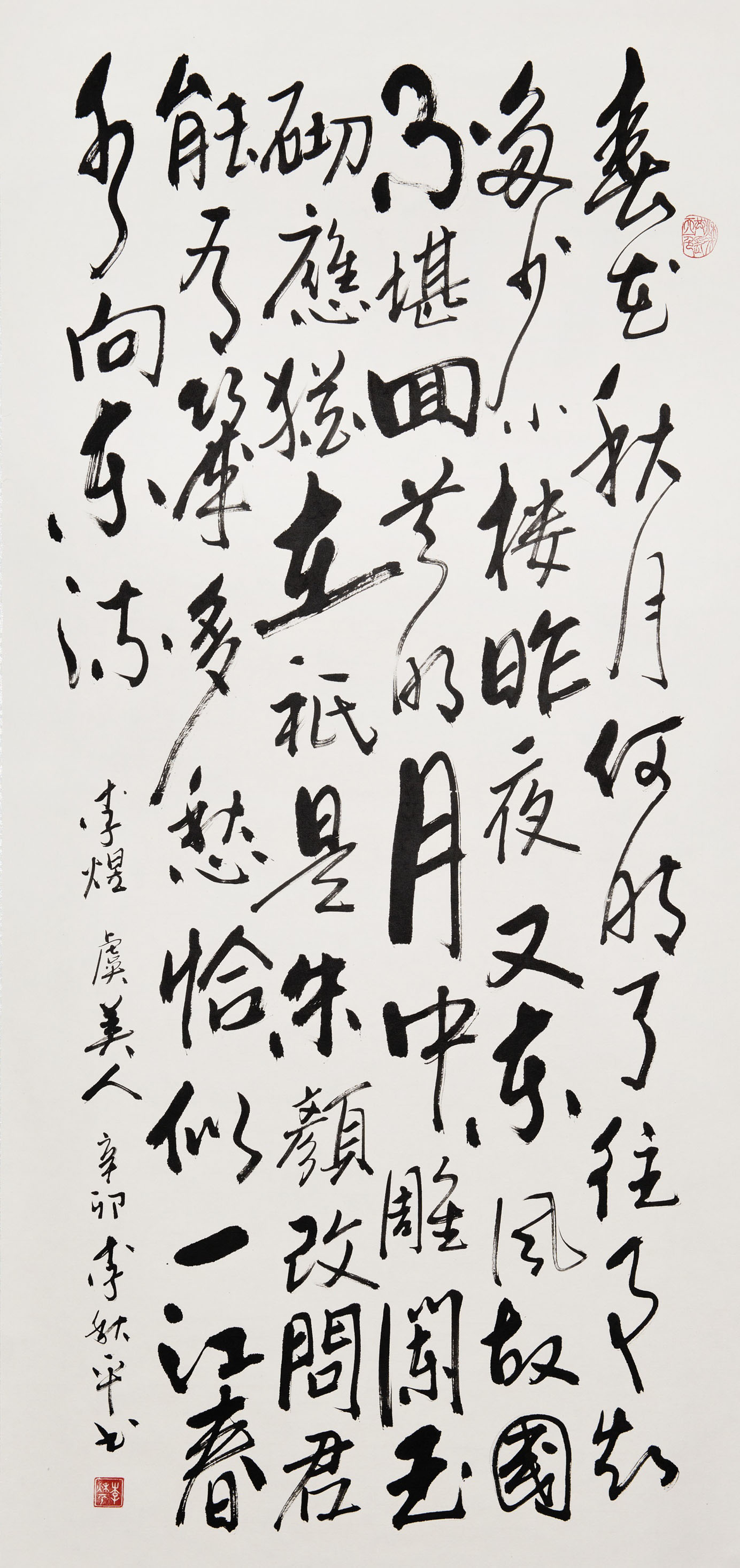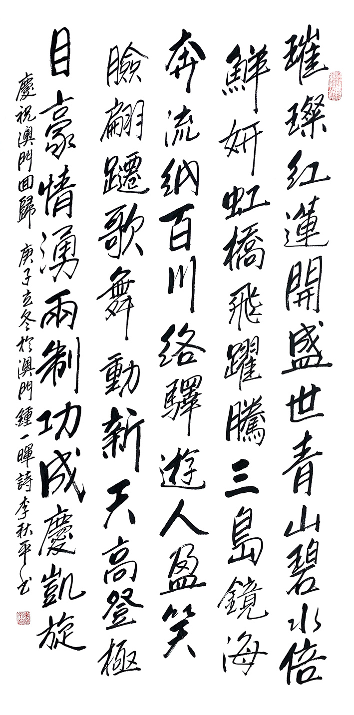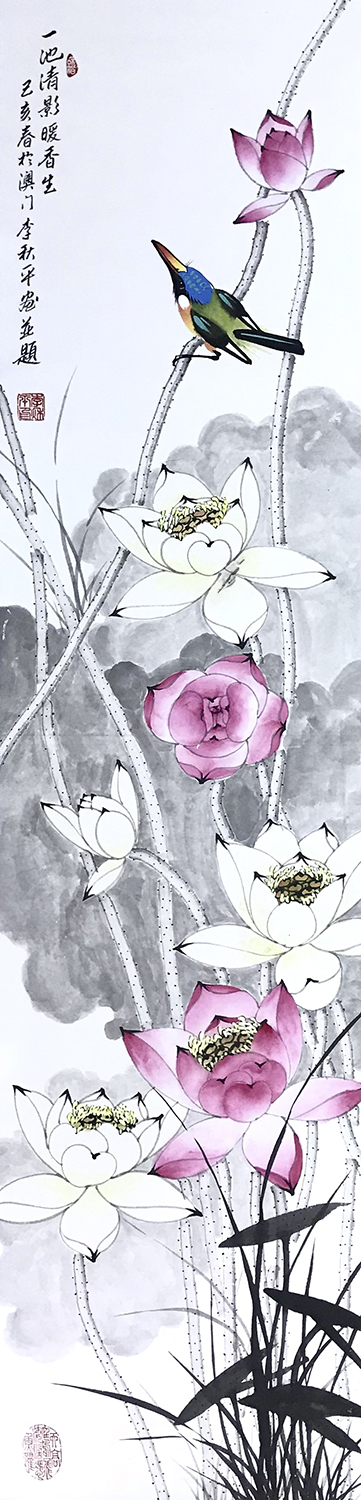 李秋平50年笔墨相随,勤学不绝,德艺双馨,其画风以花鸟、山水画为主,尢擅牡丹、荷花、竹树、菊花、小鸟等;书法擅长行草。现任北京理工大学书画班客座教授;现于澳门大学、澳门道教协会、佛教协会、基督教澳门圣公会、澳门南光集团及其他多个社团教授中国水墨画班及中国书法班。10年多以来,学生众多,其中不乏商贾名人,并曾于澳门文化局及教青局教授绘画扇面及中国水墨画,每次都好评如潮。10多年来并担任两岸四地儿童书画比赛、全澳门中小学生硬笔、毛笔书法比赛及全澳门中学生道德经书法比赛的主评审委员。作品常被中国、美国、英国、加拿大、法国、澳洲、比利时、葡萄牙、日本、韩国、台湾、星加坡、马来西亚、印尼、泰国、香港、澳门好友及博物馆等收购珍藏。