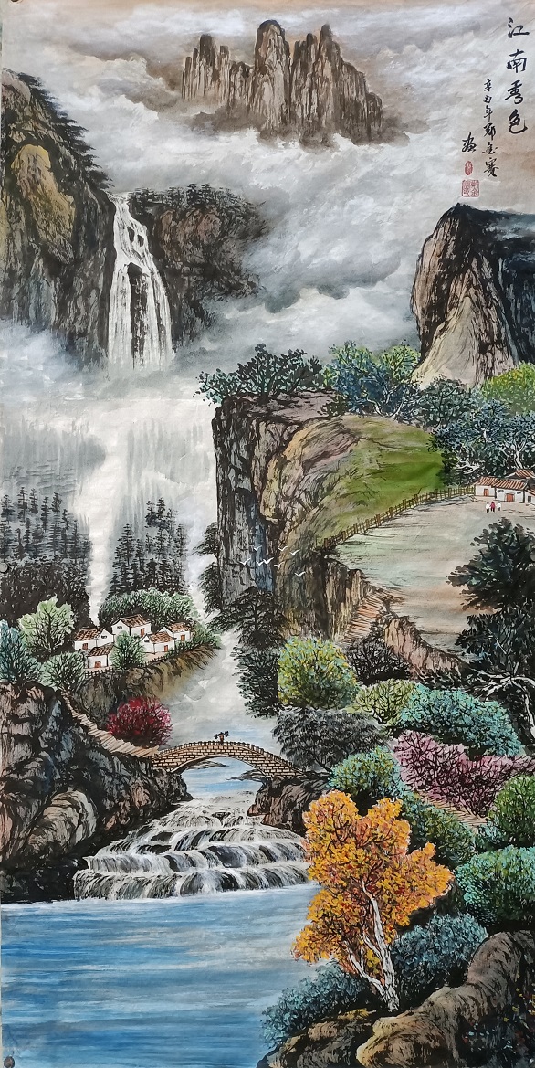 郑金赛先生作工笔山水,有师法古人的价值观,也有师法自然的进取力。师古人,取上法。通过对历代名家作品的精研覃思,心追手临,取法为上的路径走得特别扎实,终于是获得了得法亦为上乘的真功夫。所以看他的山水作品,就有沈周山水的形神兼备,色彩流丽,极是一天清淑气,万里碧榆风的好气象。也有仇英山水的极致工细,画物象必是精益求精,一丝不苟。怪不得先生画性超人,其丹青才华在大江南北深有佳论!取古人之法,让他的山水作品最有古今永传的文化格局。