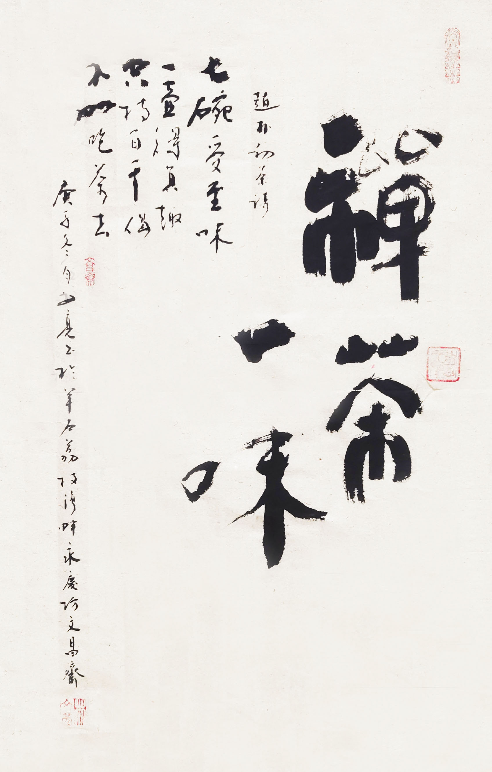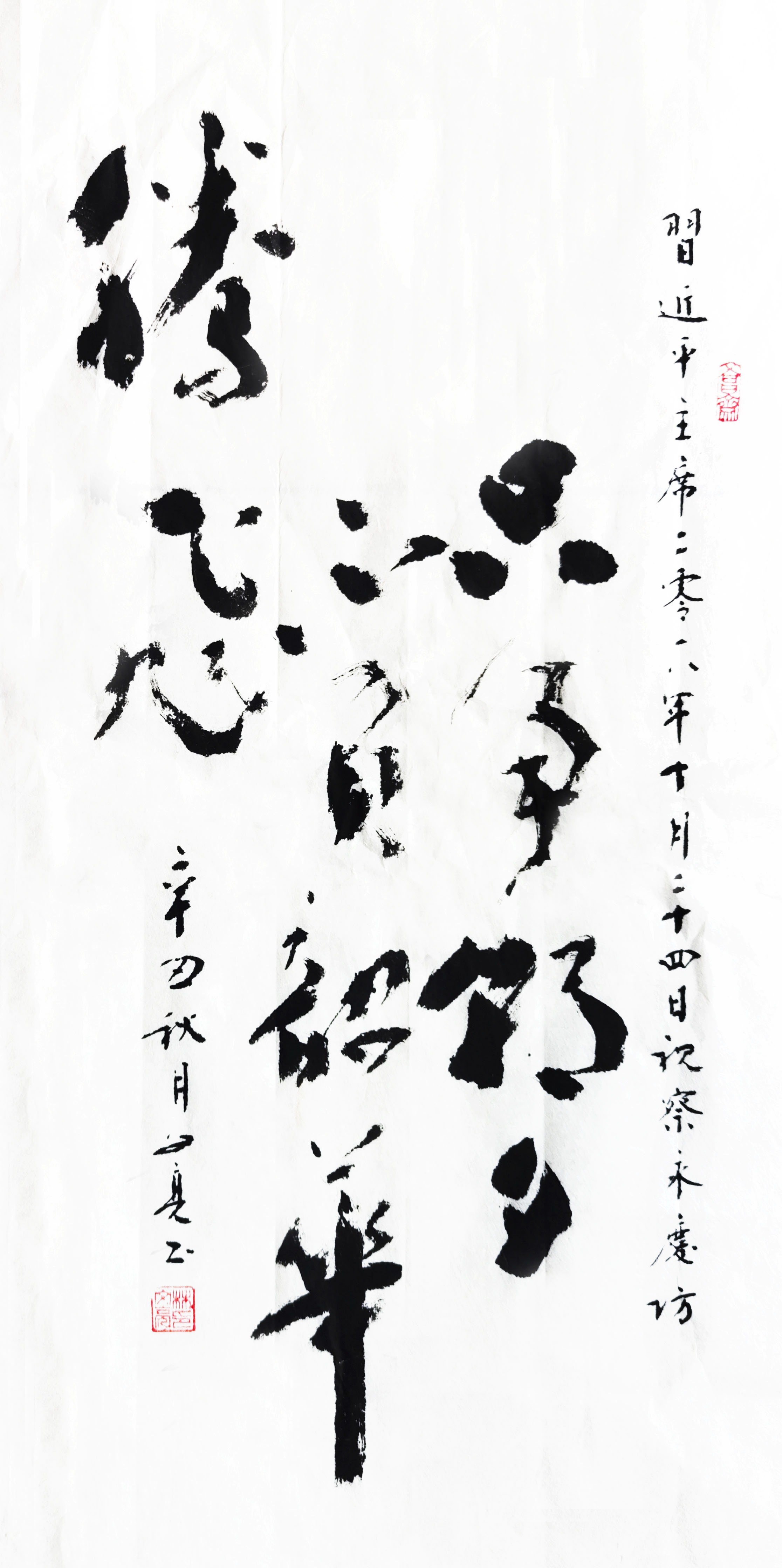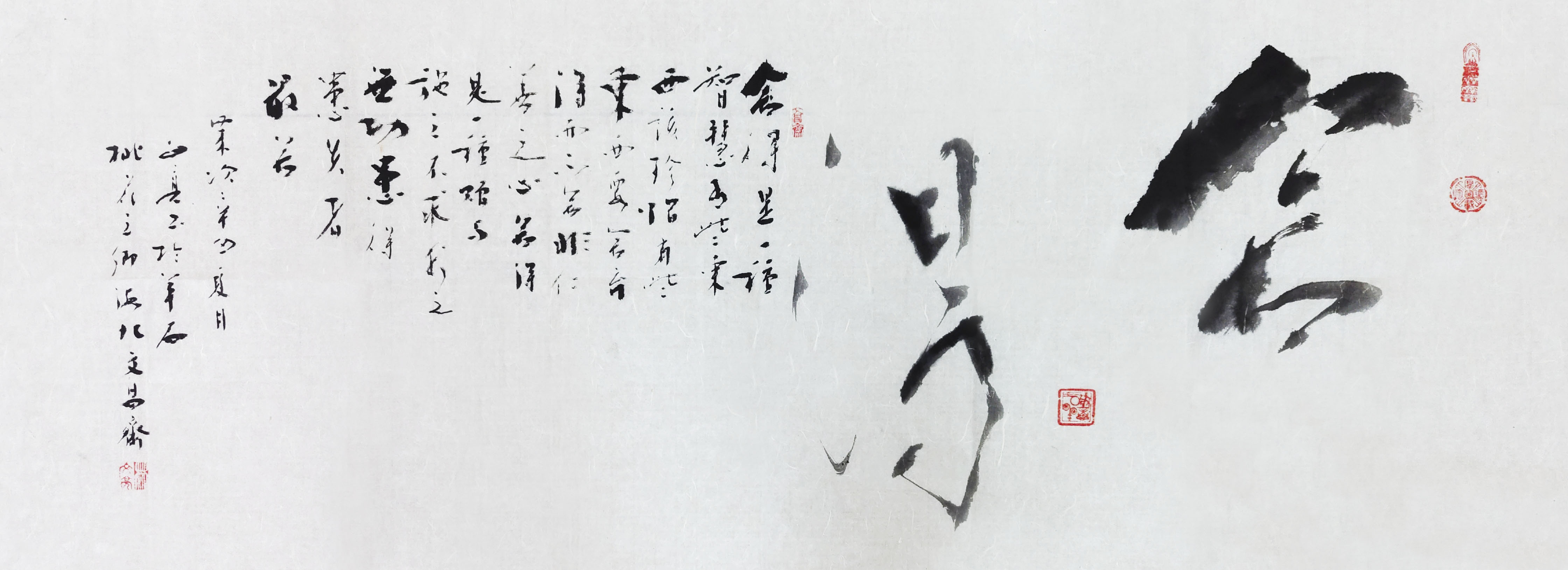笔墨娴熟,空间灵动。林先生的书法不但贵有笔墨娴熟的技法,还有空间灵动的表现。看过他写的《福寿》,必然会惊讶于以黑计白的空间结构智慧!福字有镜像之妙,点划飞逸,有的如螳螂抱枝,有的如山蜂施毒,点的状态深刻影响着空间的妙有。书法如果没有既重视线条,又兼顾空间的谋策,绝然写不出这种空间多载灵性的上上品。一字见妙,一笔知功,林文亮在书坛的影响力是因意命笔的结果,也是文化修养的铺陈所得!大家作翰墨,尽皆如此!