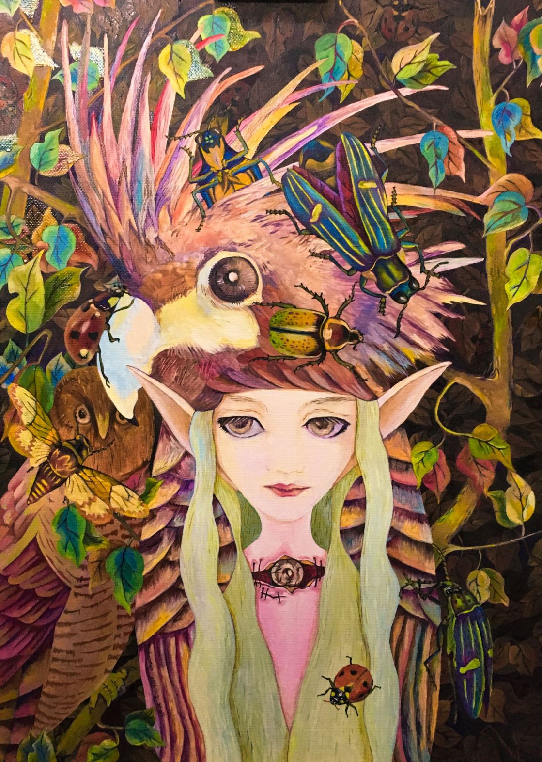 画这幅画的时候是夏天,这是我的虚构五维世界(云梦塔)里的第一个女孩形象菲翡,她是自由的飞鸟人,可变幻成女孩,也可变成各种飞鸟,在森林和各种空间里自由的潜行,昆虫们是她的信息收集员,信息百事通女孩。