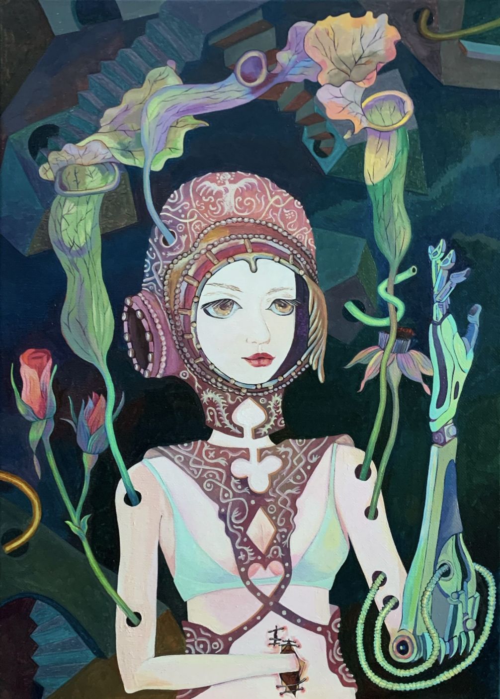 最近主要围绕一个虚构的世界(云梦塔)里发生的故事画系列油画。这个虚构的世界是一个五维的世界,画中的人物和动物大部分拥有三只眼睛,他们生活的世界里没有空间与时间的限制,是一个充满爱和美丽的世界。