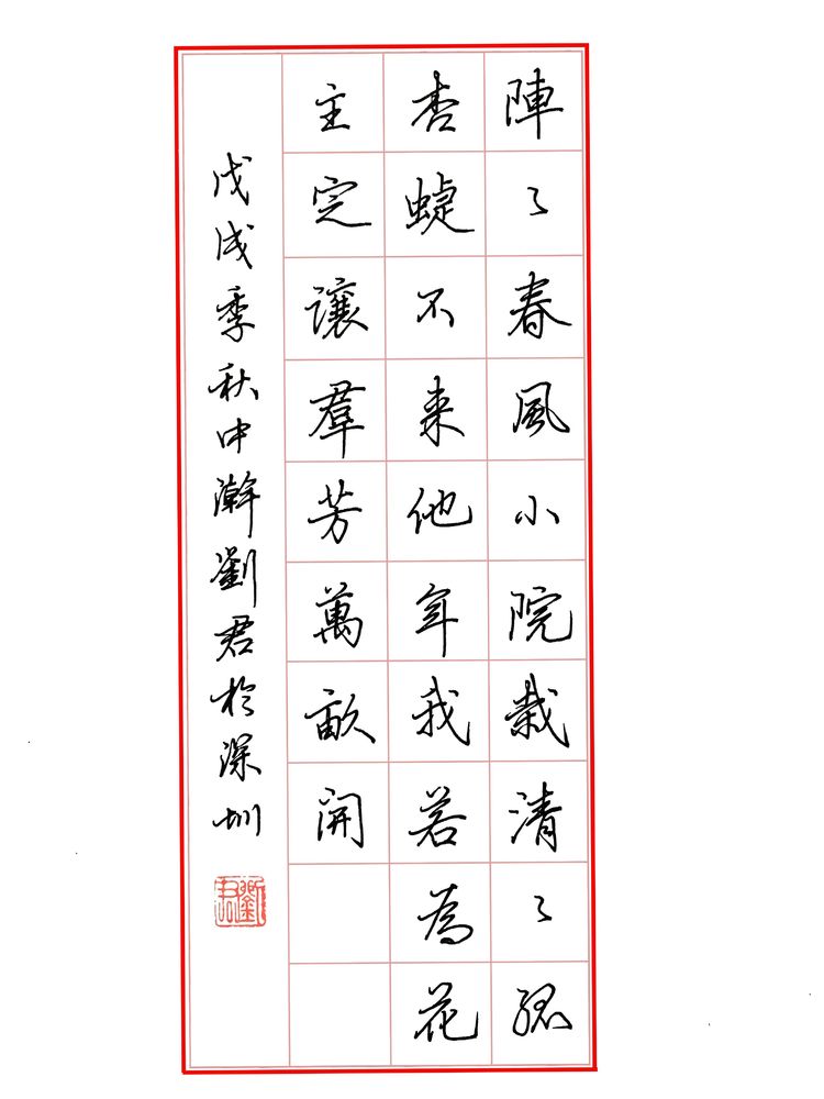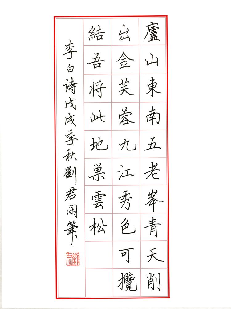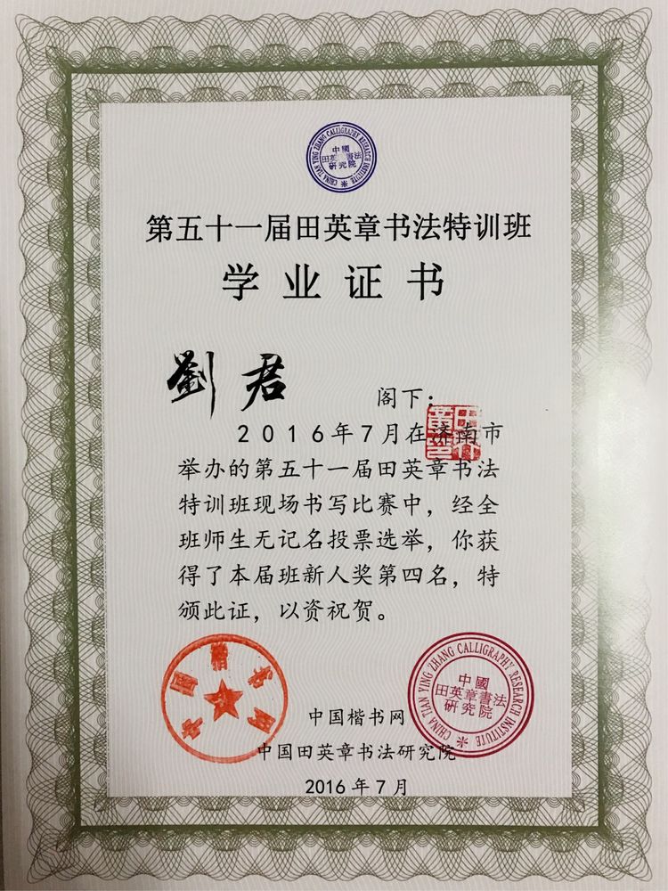 幼秉庭训,精研书艺,后随著名书法家田英章先生及其入室弟子黄晓东老师学习欧体楷书,并多次参加田英章老师书法特训班,练就出软硬笔兼施的本领,其作品荣获第五十一届田英章书法