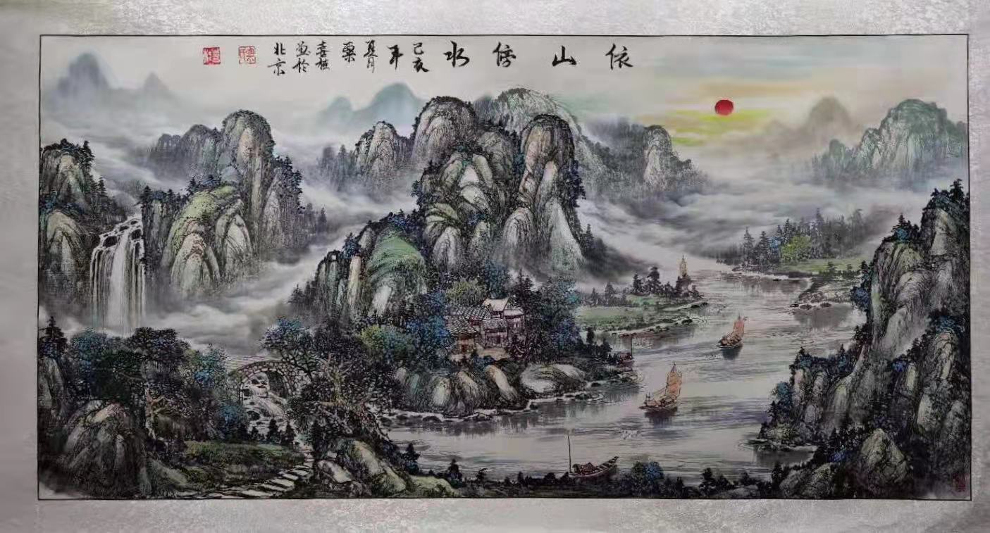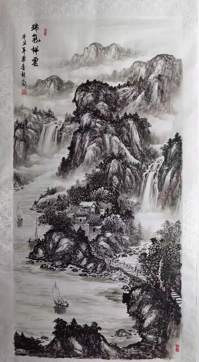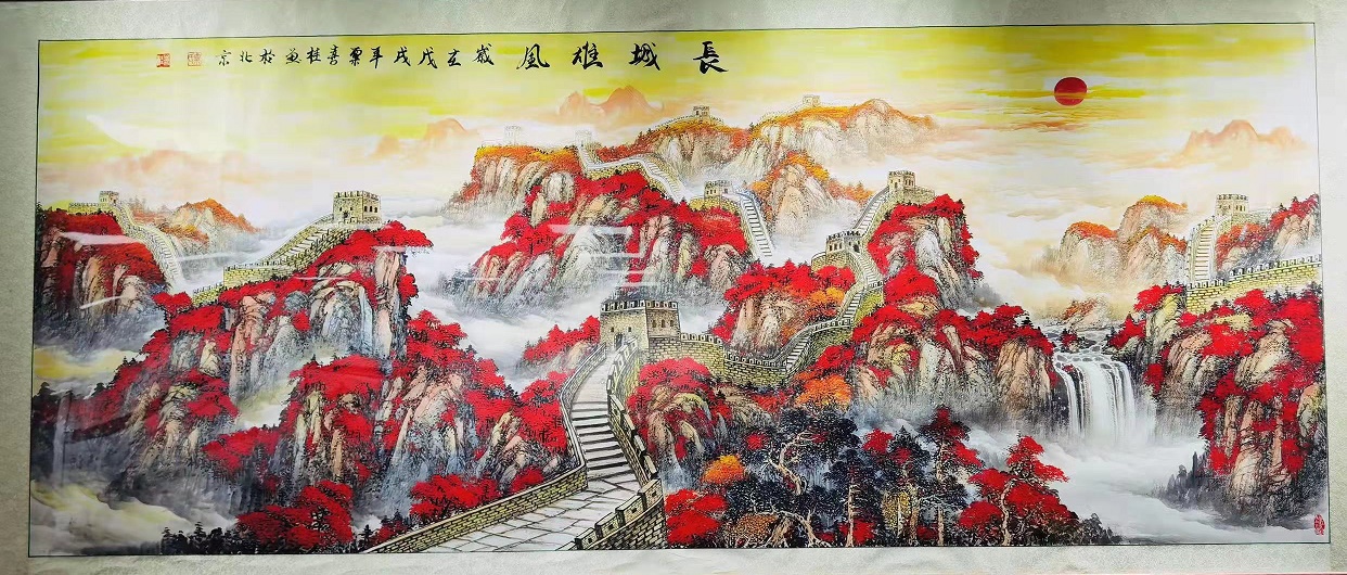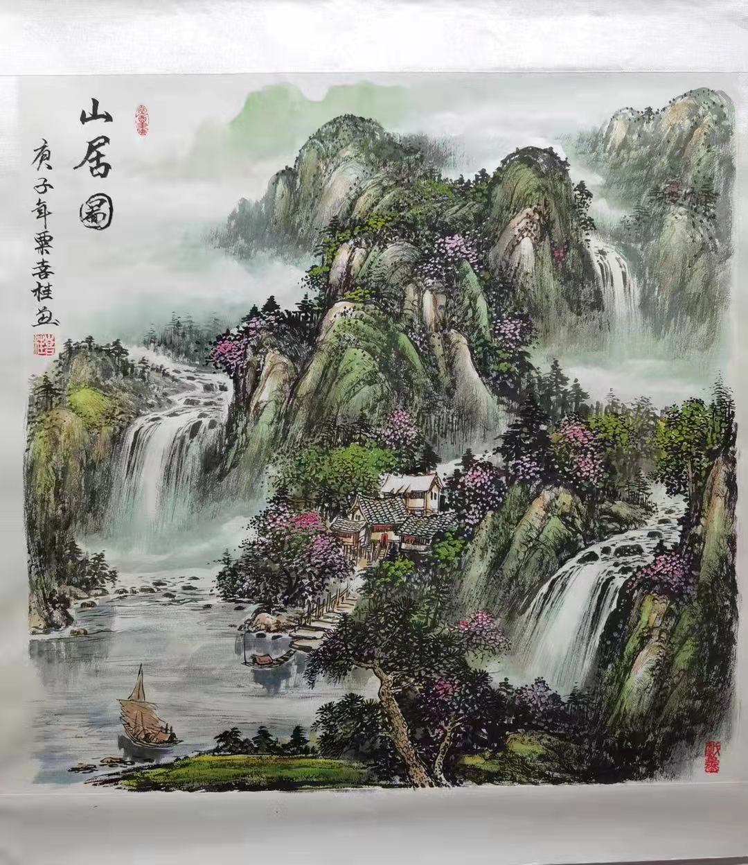 粟喜桂山水创作题材广泛,形式多样。其作品取势或大开大合,或虚实映衬;境界或波澜壮阔,或婉转起伏;变化多样而不失严谨,气脉连贯而各有侧重。既有北方山水的雄浑,也有江南水乡的韵律…….但无论是“骏马秋风塞北”,还是“杏花烟雨江南”,都体现出画家开阔的胸襟与激荡的情感。加之其遒劲有力的笔骨,浓淡分明的用墨,节奏明快的着色,总是让人欲罢不能。