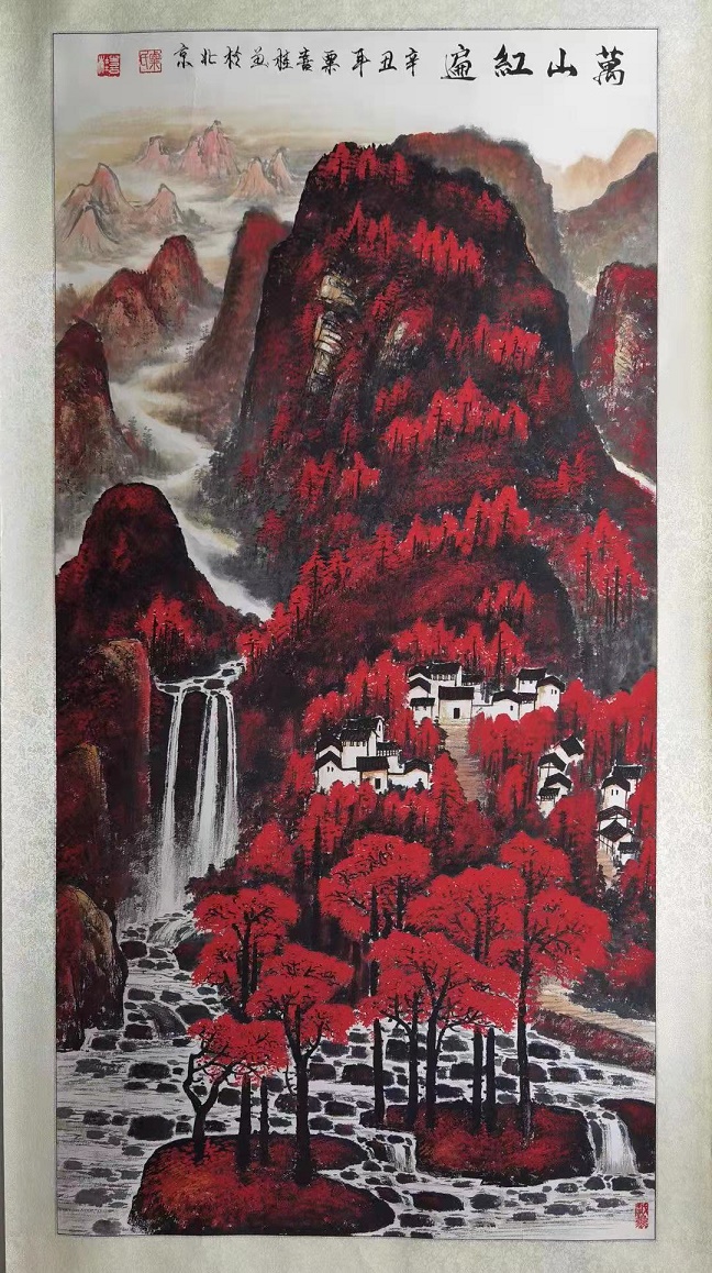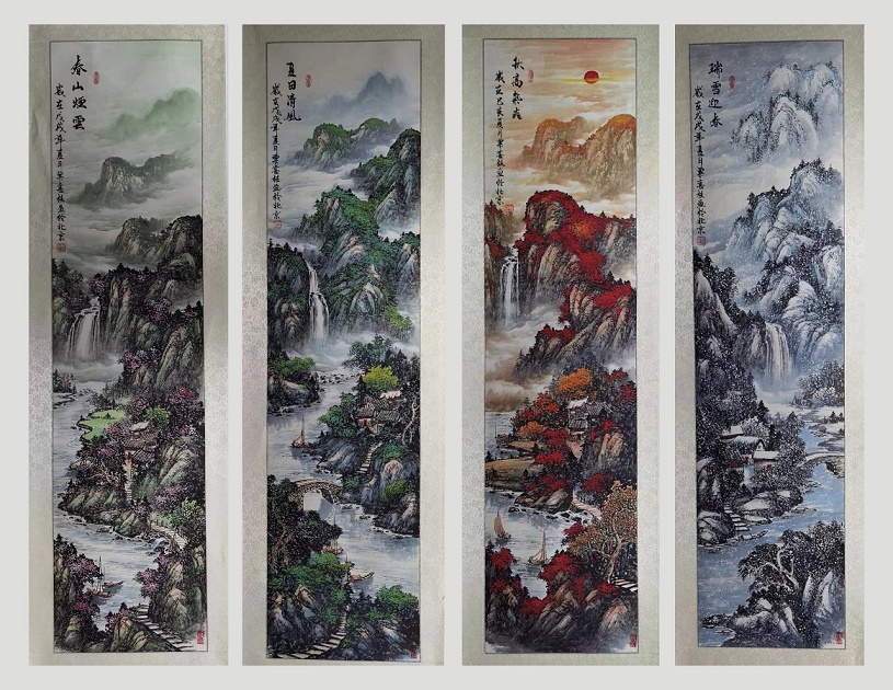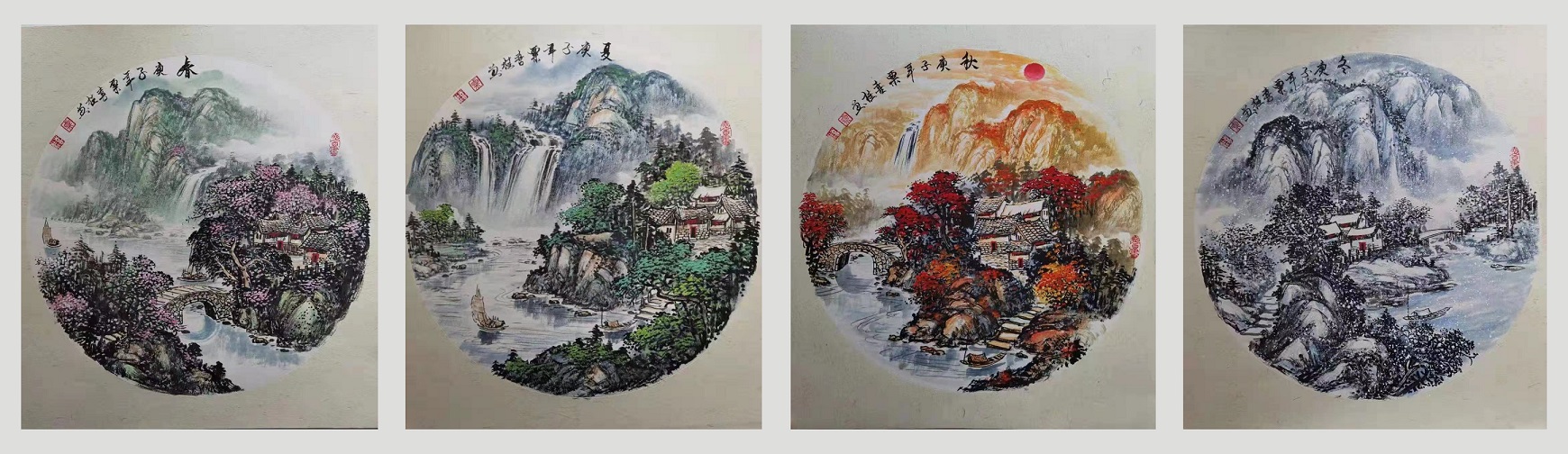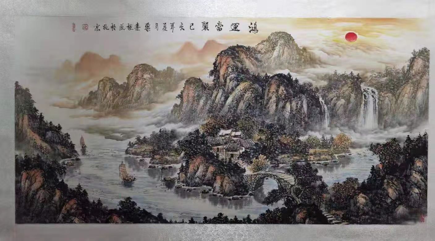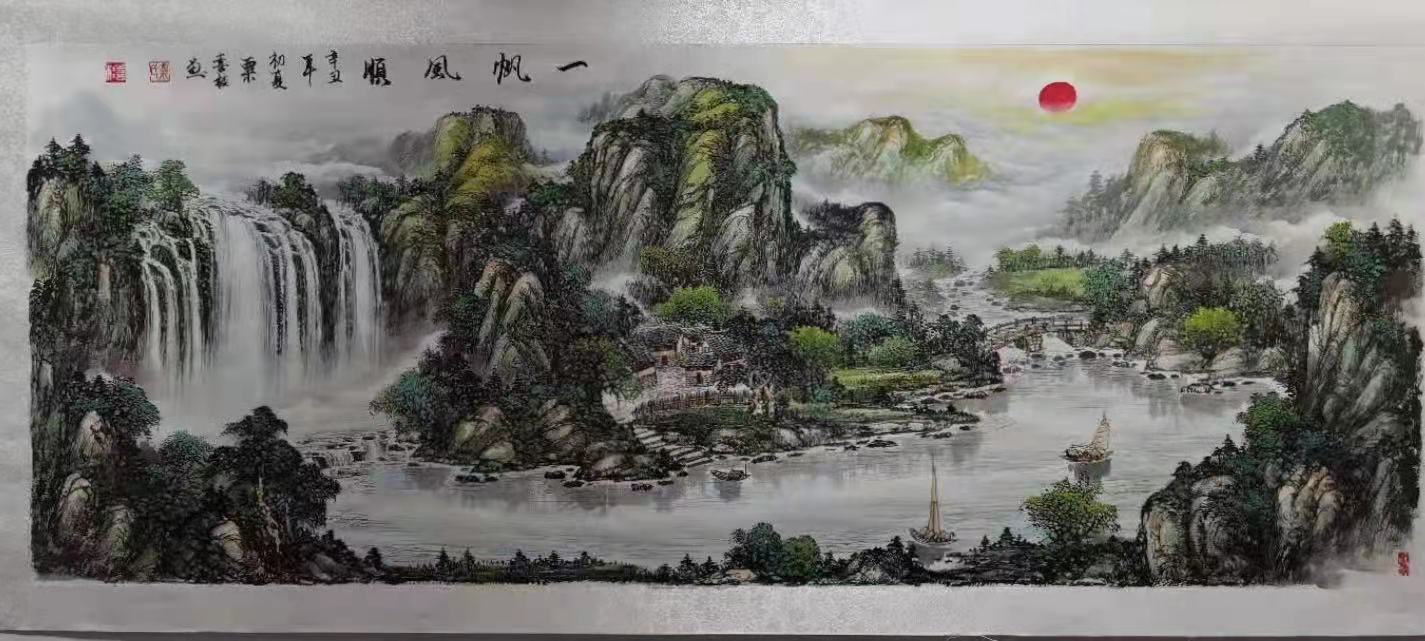 粟喜桂山水创作题材广泛,形式多样。其作品取势或大开大合,或虚实映衬;境界或波澜壮阔,或婉转起伏;变化多样而不失严谨,气脉连贯而各有侧重。既有北方山水的雄浑,也有江南水乡的韵律…….但无论是“骏马秋风塞北”,还是“杏花烟雨江南”,都体现出画家开阔的胸襟与激荡的情感。加之其遒劲有力的笔骨,浓淡分明的用墨,节奏明快的着色,总是让人欲罢不能。