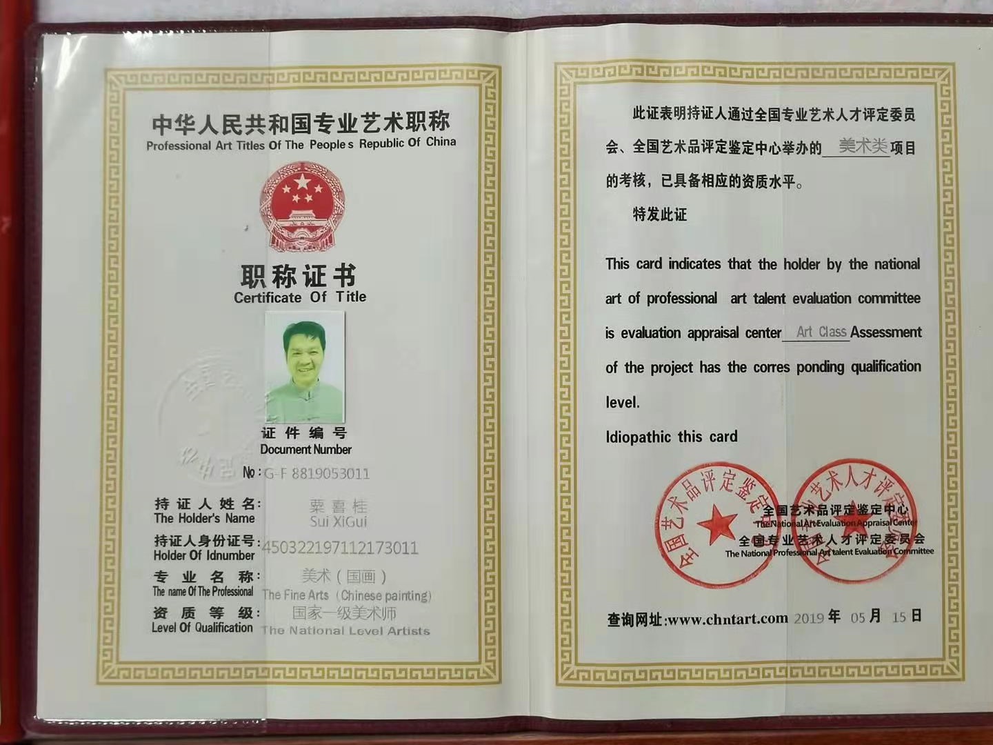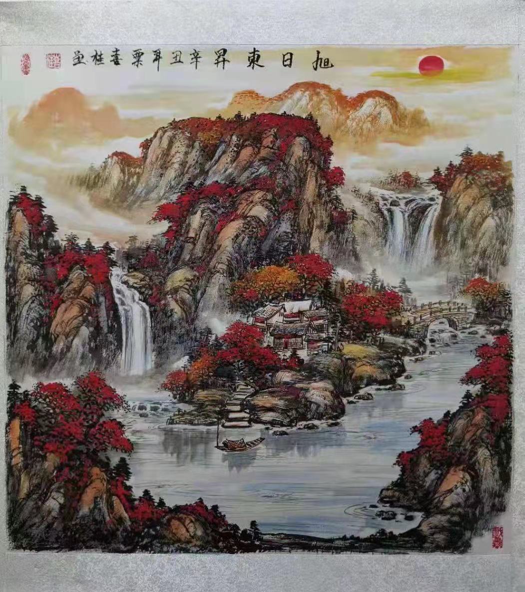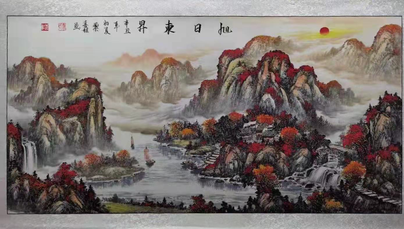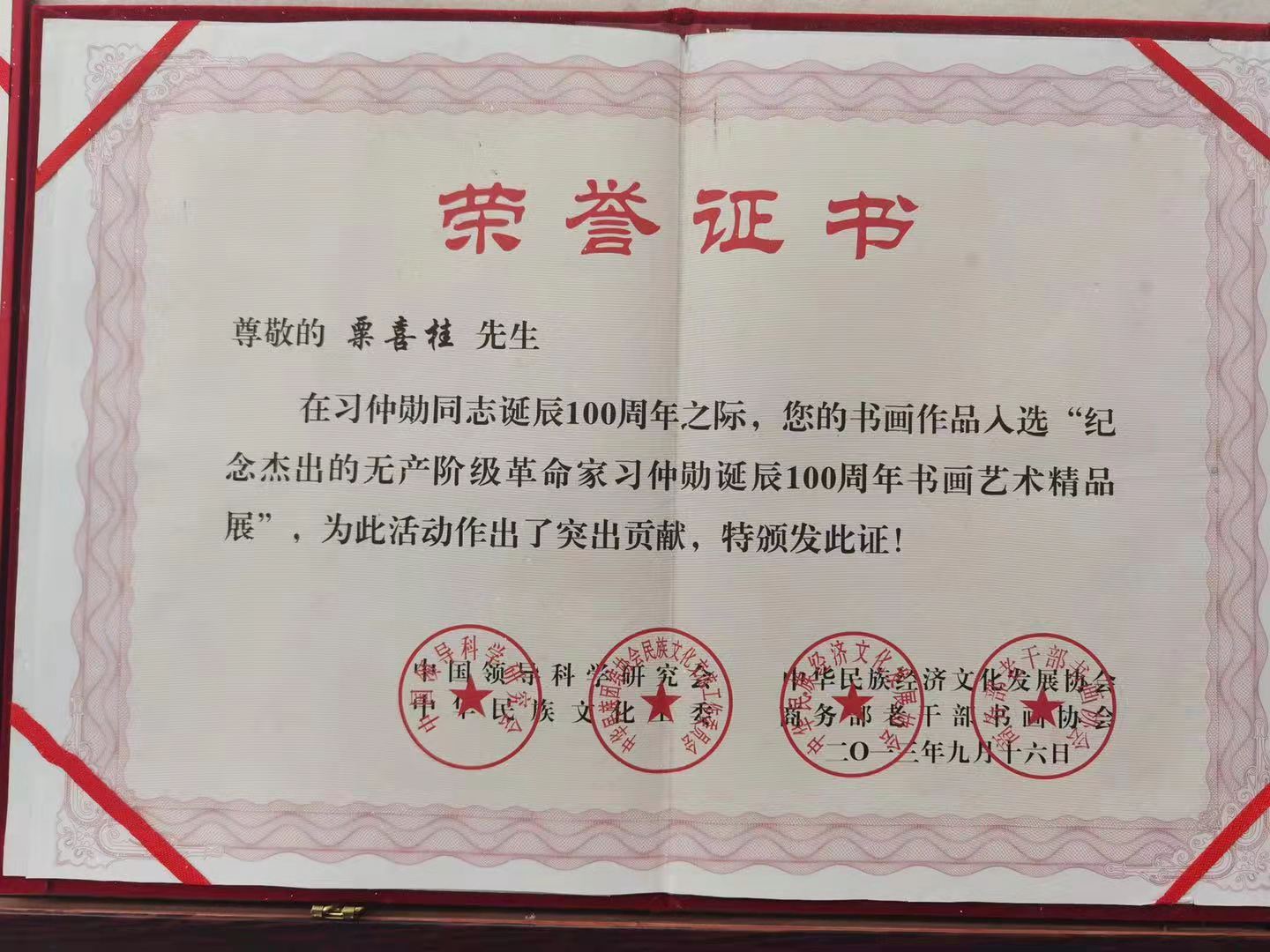 作品《春溢山河》与《鸿运当头》和名字“粟喜桂”同时收录在《中国名人书画艺术大典》;作品《旭日东升》被国防部收藏,作品《依山傍水》被军事博物馆收藏;作品《春溢山河》被国家领导人作为国礼赠送给国外元首。粟喜桂称得上中国当代最具收藏价值的实力派画家。