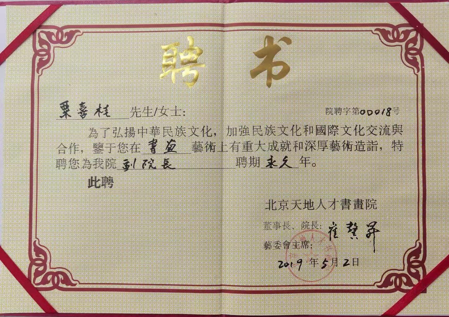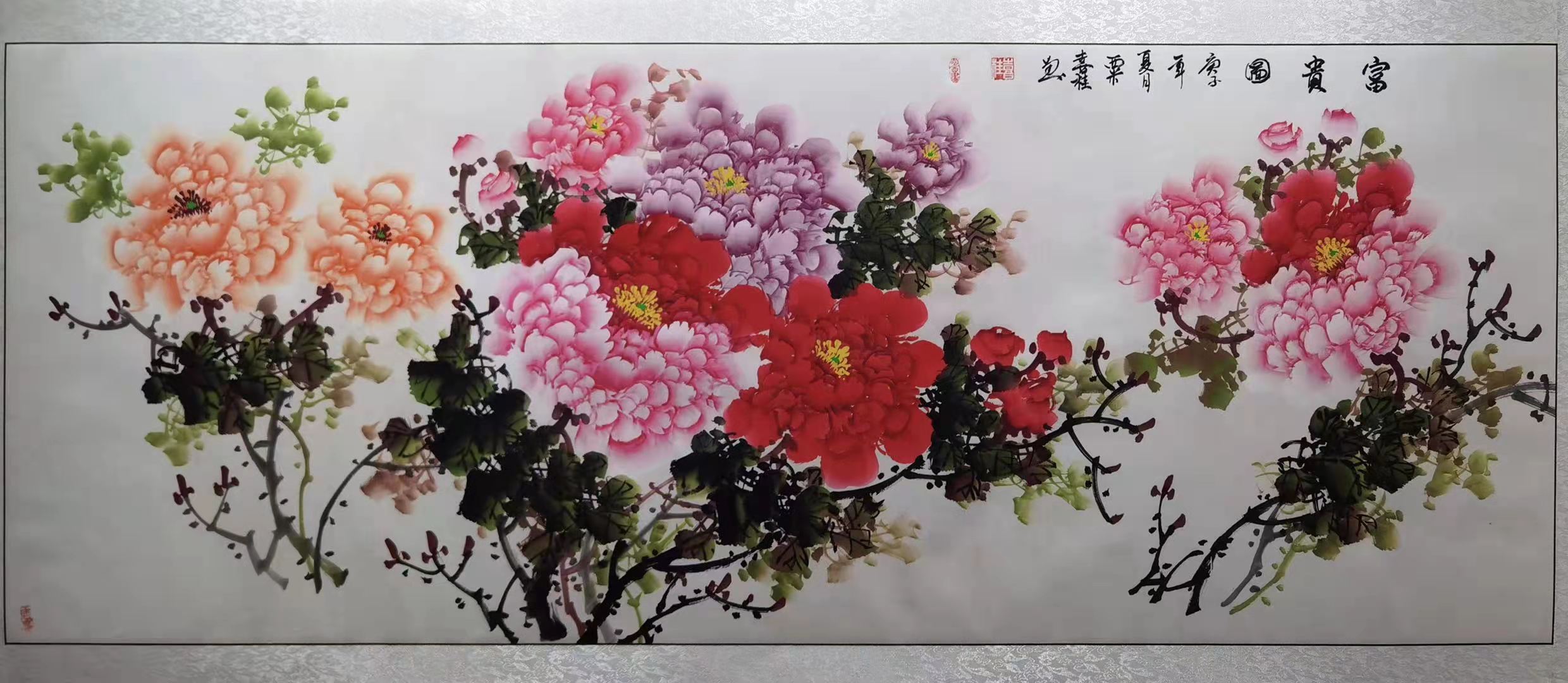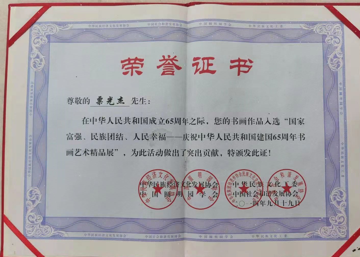 作品《春溢山河》与《鸿运当头》和名字“粟喜桂”同时收录在《中国名人书画艺术大典》;作品《旭日东升》被国防部收藏,作品《依山傍水》被军事博物馆收藏;作品《春溢山河》被国家领导人作为国礼赠送给国外元首。粟喜桂称得上中国当代最具收藏价值的实力派画家。