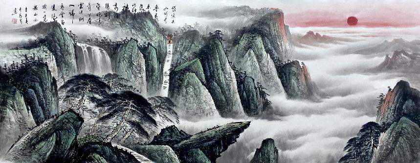 蒋息有老师的这幅《旭日东升》刻画的便是青壮年的山水之乐,墨法苍润,格调古朴,远近景浓淡有序。苍翠青山,拔地而起,显示着旺盛的生命力,而苍松却纯点墨色,二者形成强烈的对比,反衬出青山的活力青春。画面左幅青山高耸,右幅红日升空,映照半山,红绿色亦形成强烈的对比,十分巧妙。整个画面大开大合,设色巧妙,寓意着人生和事业红红火火、如日中天。