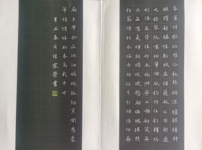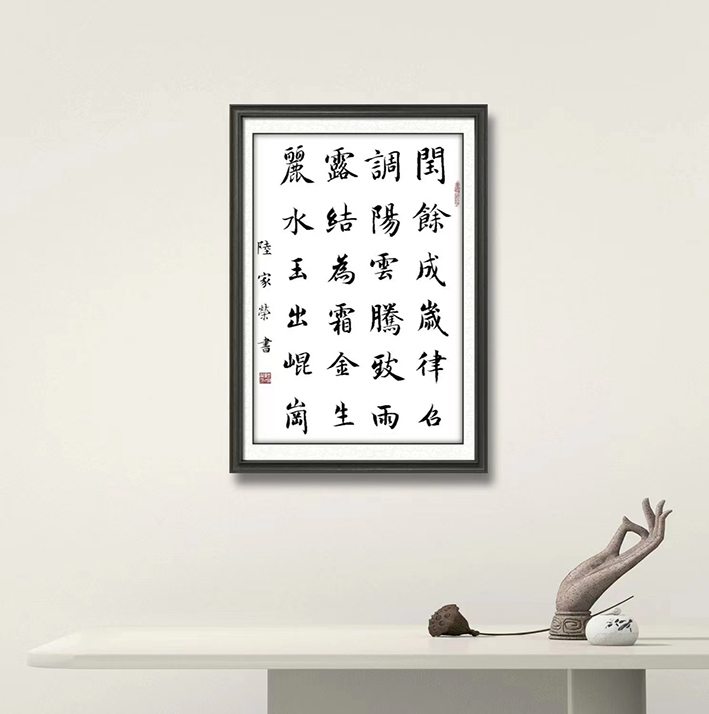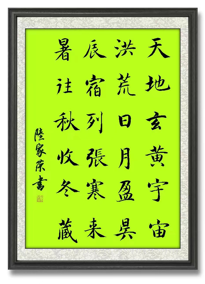 陆家荣,字红莲,号荷城居士。1994年出生于广西贵港。2016年加入中国共产党,贵港市青年书法家协会会员、中国硬笔书法协会会员、全国规范字高级教师。