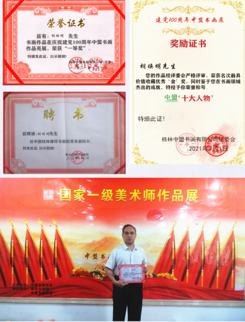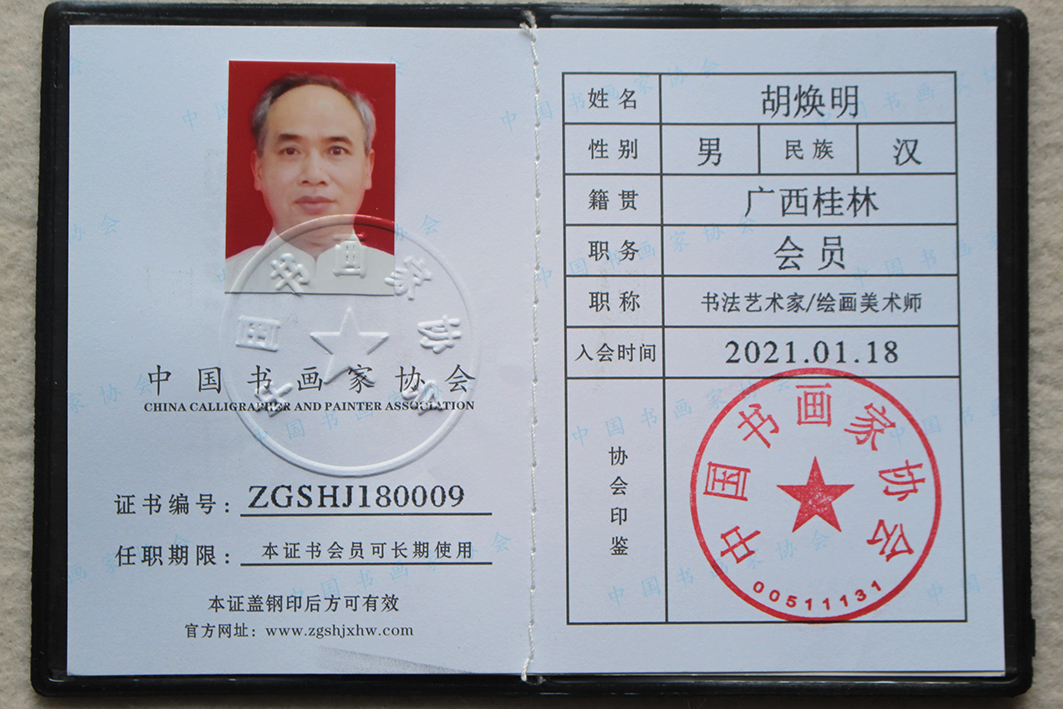 胡焕明:广西省桂林人,1963年出生。毕业于广西师范大学(艺术系),从小爱好书法,1975年跟着中国书画家协会会员周宏镐老师学习行草,2016年得广西师大兰阳教授点评后学习行书,2018内任桂林御印书画院常务院长,2021年加入桂林中盟书画有限公司书画家,中盟书画实习地老师,中盟书画院在庆祝建党一百周年作品展上,书写的北国风光作品,荣获“一等奖”,2022年荣获国家一级书法师资质、中国书2022年桂林中盟书画组委员,书法作品被中外书法爱好者收藏……