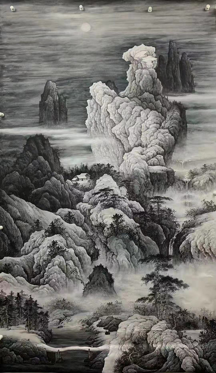 他走遍大江南北,名山大川,尝乡间疾苦,不管春夏秋冬,穿梭在山水之间,他笔笔深情,谱写出一幅幅锦绣画卷。他在古人绘画的基础上进行了深入研究和探讨,依托古人的传统与现代写实相结合,除运用块面形体塑造外,采用笔墨的勾、勒、点、擦、皴、染,描述着自然的和谐之美,通过细节的深度刻画来展现山河的壮丽,强化大自然在他画作中的真实感,超出了一般国画所表现的形式。写 出了古代文明与现代精神的交相辉映,又展现着作者的对民族历史文化的哲学思考和深厚情感。