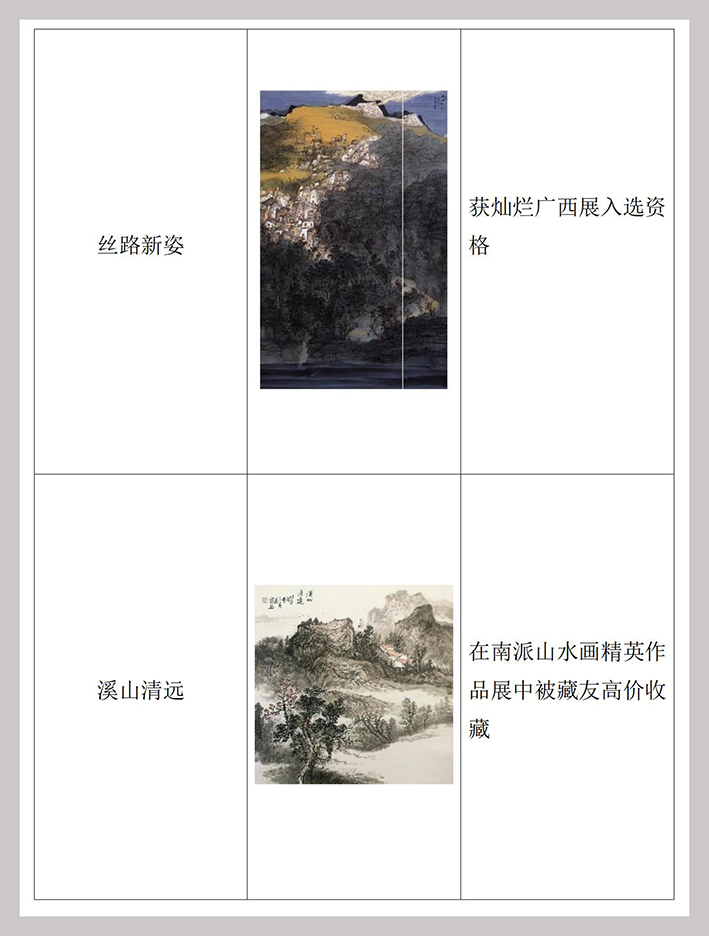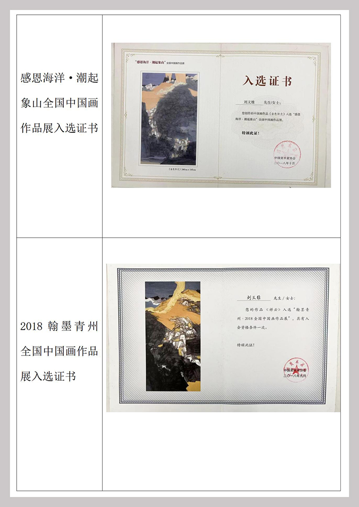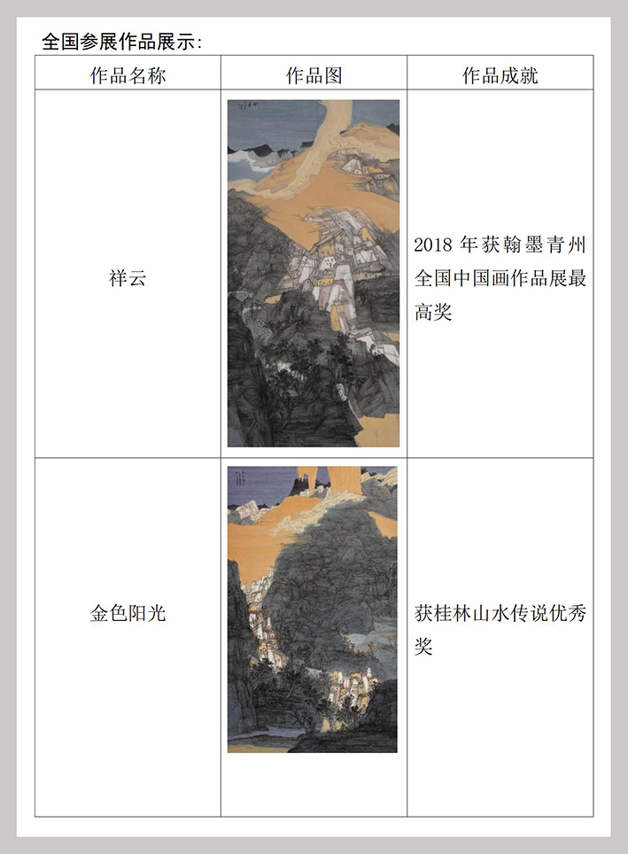 2018年作品(祥云)翰墨青州全国中国画作品展最高奖。 2018年作品(金色阳光)感恩海洋·潮起象山,全国中国画作品展入选。