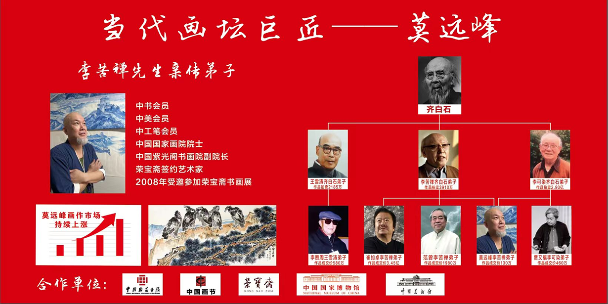 李苦禅先生是齐白石第一个入室弟子,1923年即拜入齐白石门下,李苦禅也是白石老人平生最得意的高足,他称:“人皆师余手,英(李苦禅原名李英)也夺我心。”、“英也过我”,又称其画:“雪个先生(八大山人)无此超纵,白石老人无此肝胆。”莫远峰作为李苦禅的入室弟子,更是名正言顺的齐白石再传弟子。