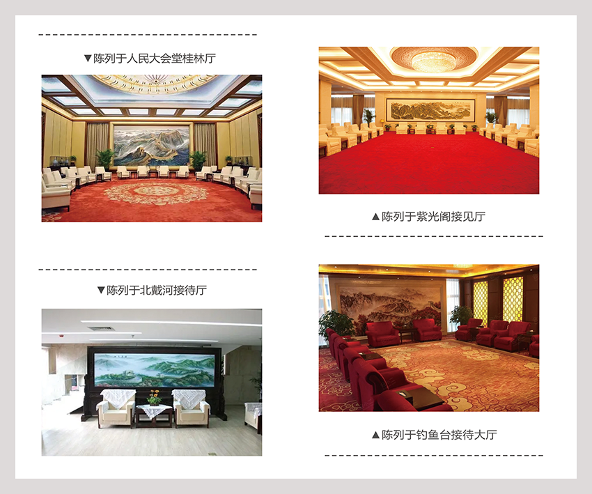 其作品多表现于沉宏博大、雄浑壮观的气象,曾为人民大会堂广西厅、紫光阁接见厅、钓鱼台国宾馆创作多幅巨作,陈列于国家殿堂。