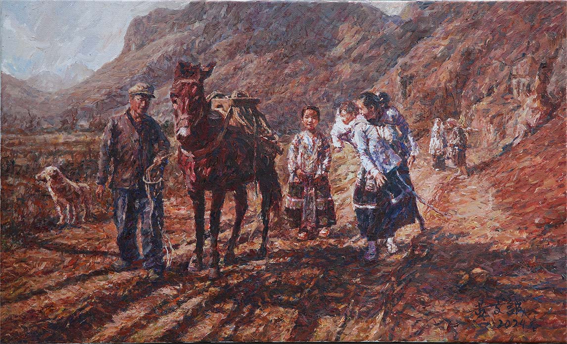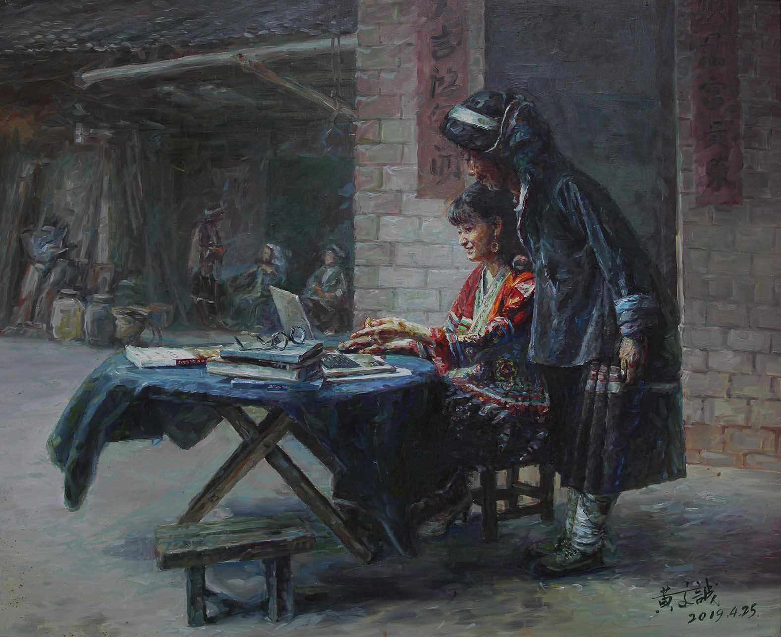 他所创作的作品,虽然都是普普通通的百姓生活。然而,人们会发现这也正是这种普通却表现了中华民族优秀传统所赋予的纯朴、善良、包容、勤劳等优秀品质。更重要的是作品留给我们的不光是美的视觉感受,还留给我们心灵上的思考。黄文诚坚持乡土油画研究四十年,初心不忘,始终如一。艺术创造是一个心灵结构场,是创造一个新生命,建构一小宇宙,是在感觉形式中感悟生命,或在诗意中感悟生命。它不仅仅是一种艺术表现形式,更是对乡土文化、传统文化的深刻挖掘与传承!乡土油画的精神内涵主要体现在其批判与反思的结合上。一是它通过对乡村生活的真实再现,是现代文明对乡土文化的对话;另一方面,它通过对乡土文化的深入挖掘和传承,反思了现代社会的急需问题。这种批判与反思的精神,使得黄文诚的乡土油画具有了高度的社会历史责任感和文化价值。尤其是现行的文化振兴乡村、大美育乡村的大环境下更显示出它的重要性!