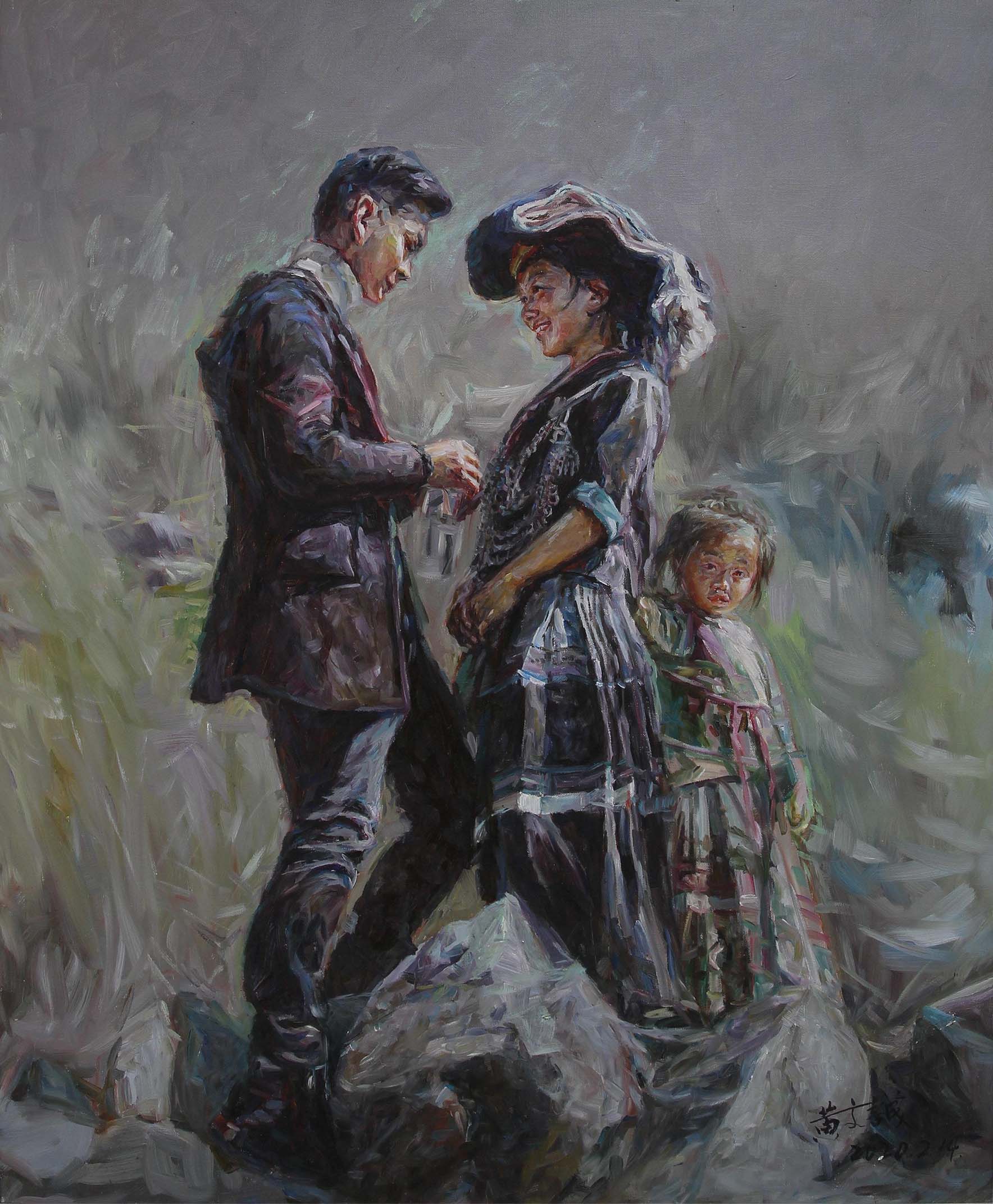 追溯中国华夏上万年的文化根系,到炎黄子孙的年代,历史记载,5000多年前的蚩尤(伏羲后裔)为苗族先王,当时苗族文化相当发达,蚩尤带领九黎氏族部落在这中原一带兴农耕、冶铜铁、制五兵、创百艺、明天道、理教化,为中华早期文明的形成做出了杰出贡献。后经历史上闻名的逐鹿大战中,被炎黄两帝联合打败,败后九黎部落大部分同化于汉族;故有了”黎民百性”之成语。但当时的历史环境不灭九族已为文明之举,可当时的"黎民"为奴隶,"百姓"才是贵族。其中小部分逐渐迁到中国西南各省(云、贵、广西、湖南)今天黄文诚画的《黎民百姓》正是广西百色隆林徳娥村赶圩的情景,故现在的"黎民百姓"是"熟悉的"的社会,是亲如一家的世界,是和谐与共,尊纪守矩的平民老百姓,人民大众…