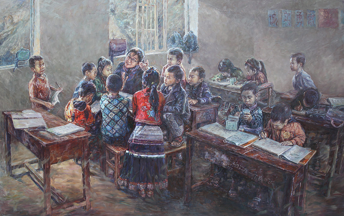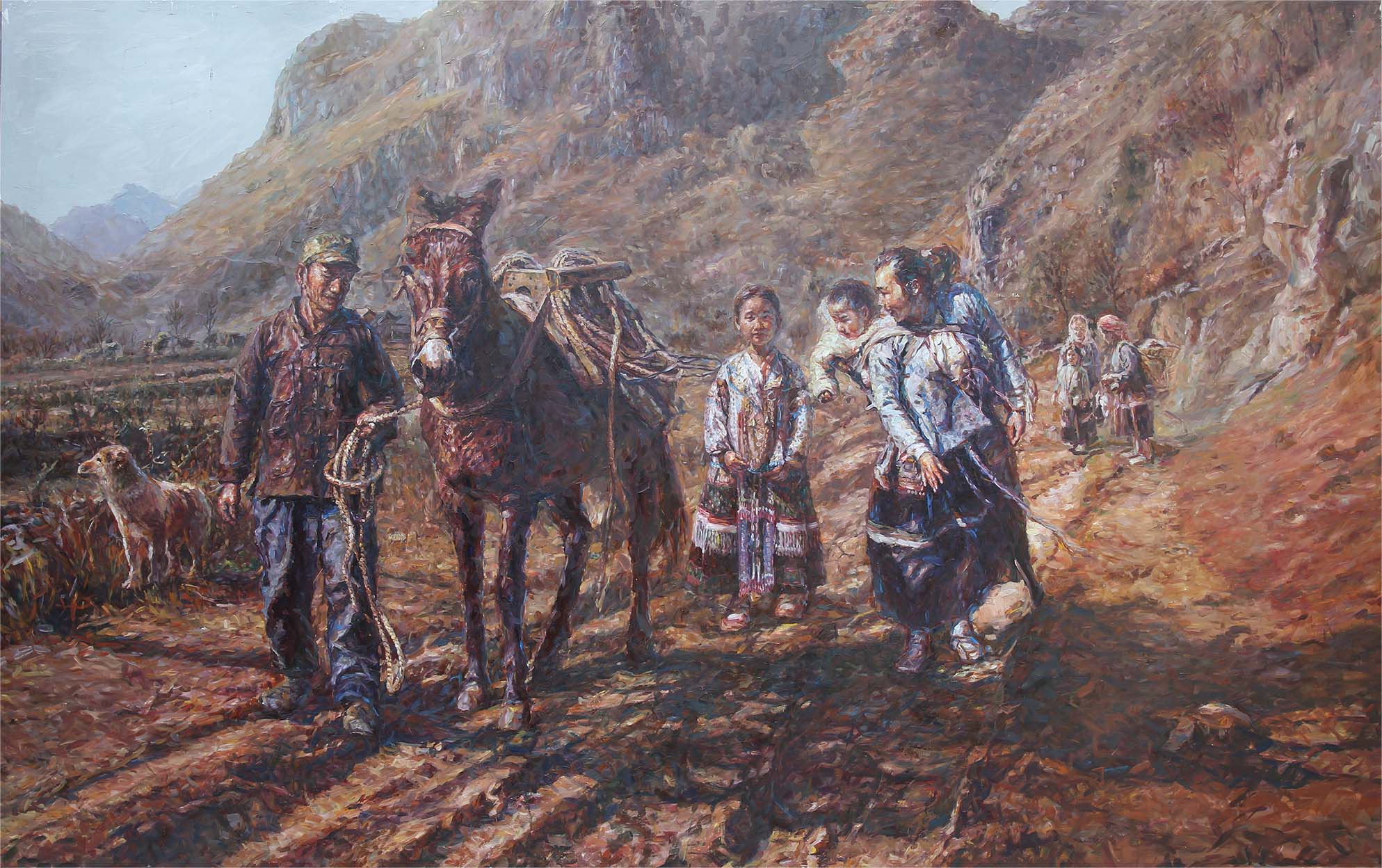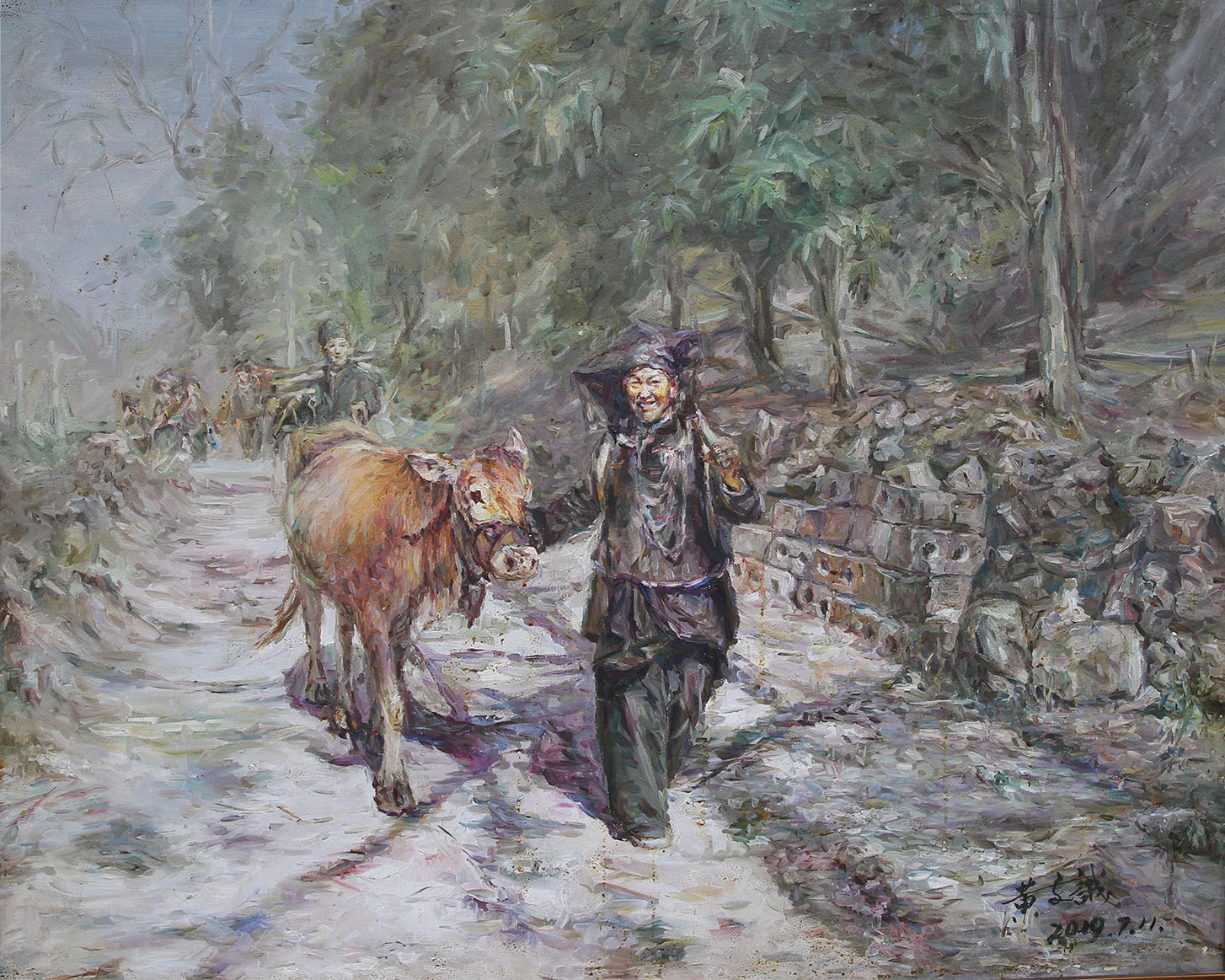 画家以其四十年如一日深入体验大山民族生活,他所创作的作品,在常人眼里也许是微不足道的,因为他所表现的都是普普通通的百姓生活。然而,人们会发现这也正是这种普通却表现了中华民族优秀传统所赋予的纯朴、善良、包容、勤劳等优秀品质。通过欣赏黄文诚的乡土作品,我们真切感受到大山里的乡土气息,自然的美感,感受到了山区人民人与人、人和动物、人和环境的和谐关系。更重要的是作品留给我们的不光是美的视觉感受,还留给我们心灵上的思考。