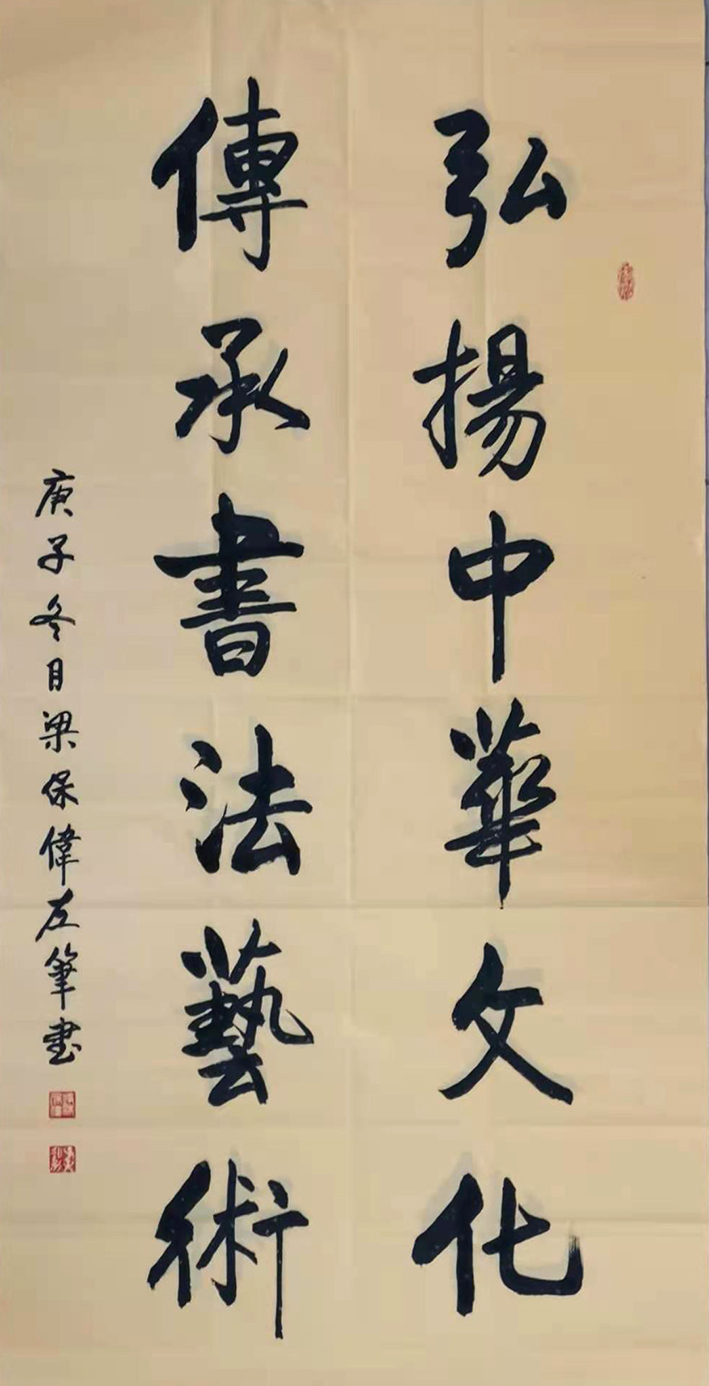 梁保伟自幼酷爱书法,二十年来,以书法作为自己生活乐趣和业余爱好。长期坚持挤时间练习。使其书法艺术得到不断提升。然而,残酷的现实,使得酷爱多年的书法又面临新的挑战。一次意外事故使他失去右手。之后他持续的书法生涯又得从零开始。梁保伟的书法以左笔书为特色,擅长临二王古帖、楷、行、草乃至毛体均可。笔力厚重到位,自成一体,耐人寻味。用笔之流畅自如,让人感动而敬佩。其临写的代表作王羲之“兰亭序”尤为得意。多幅书法作品被百度互联网收录为:精美图片展示。当地工商企业界和书法界经常邀请其现场挥毫,并以其“左笔书”而惊动艺坛。得到多位书法名家教授的评点认可。其作品被多家报刋媒体采用和社会名流所珍藏。