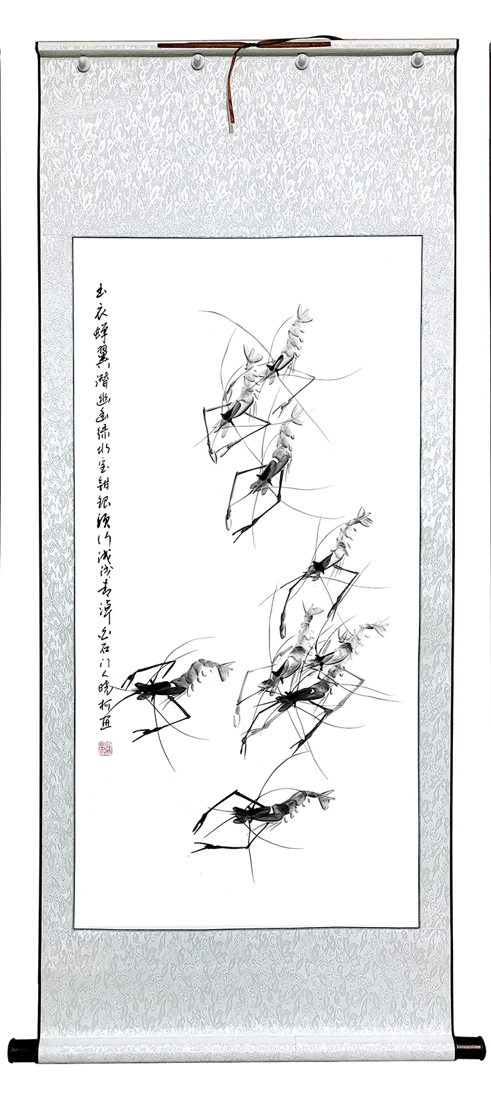 而读他的画,又似一顿精神大餐!从微观上讲,首先要看每只虾的造型是否准确,动态是否齐全。在郭晓柯先生笔下的虾,往往是静止的、漫游的、急游的、弹跳的、争食的,多种姿态,应有尽有,变化万千。那么他是如何通过画笔区分这些动态?简言之就是分别用虾臂的伸展,虾钳的开合,平衡角片的舒张,虾腹的弯曲伸展,虾须的飘逸程度体现,并根据不同的题材需要灵活出现。“白石虾”是纯“墨”虾,相较于画“彩”虾,有更大的难度,它完全靠墨色深浅浓淡来表现不同的特征。郭晓柯先生得益于娄师白的真传,又有自己多年的历炼,运用起来可谓得心应手,恰到好处。尤其是把甲壳、胸、腹节的半透明质感表现得淋漓尽致,每个腹节随着墨阶的变化,节节分明,过渡自然,犹如“清晶体”一般;即使是一笔画成的虾臂,除了用提按顿挫表现出它的“肢节”间变化外,还用自外而里的深浅渐变墨色过渡显现出它的立体感。