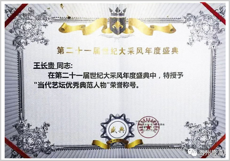 2021年7月19日,二十一界世纪大采风年度盛典暨年度人物电视总结表彰大会在首都北京隆重举行,黔西南笔山书画院院长王长贵获得“当代艺坛优秀典范人物”荣誉称号出席会议并致辞。