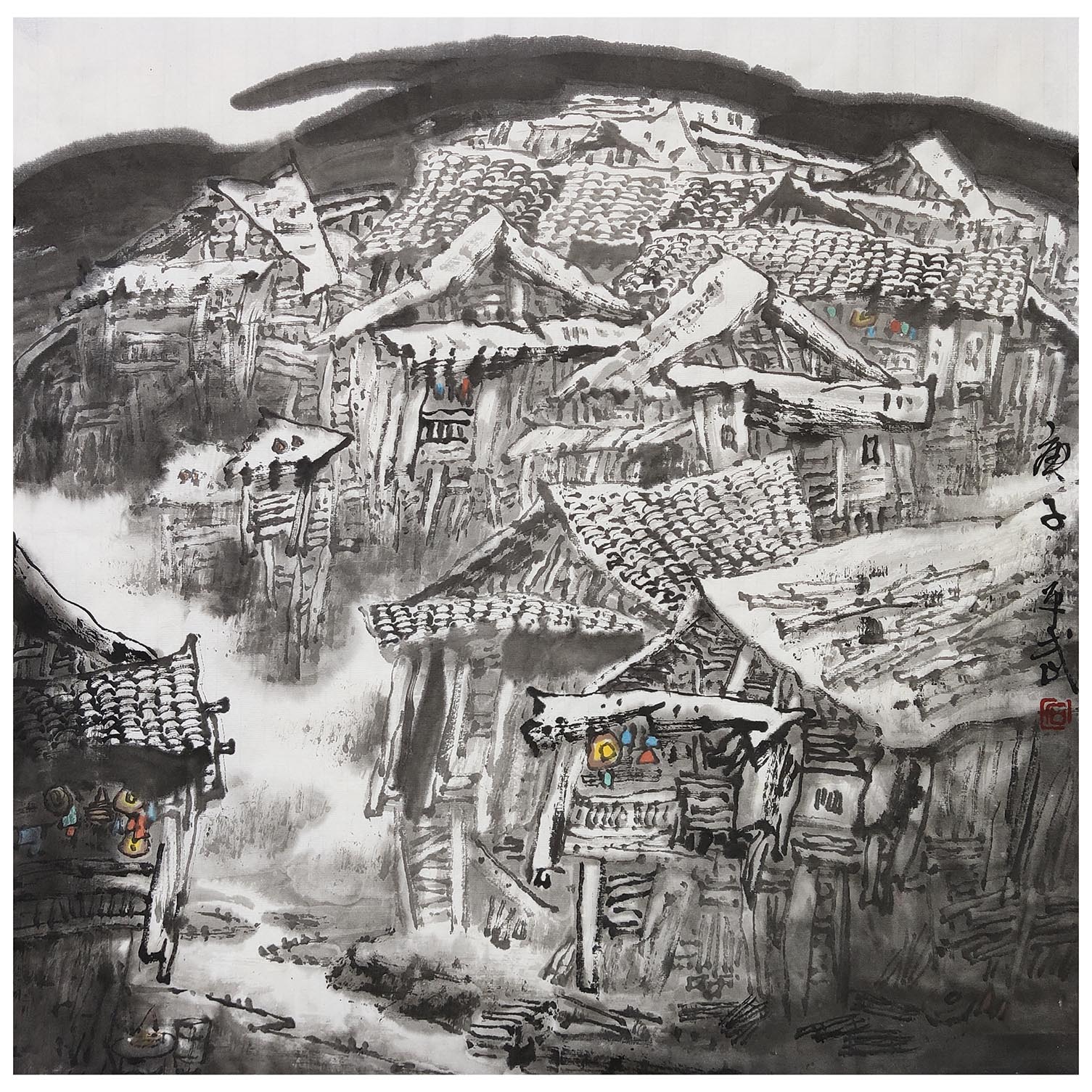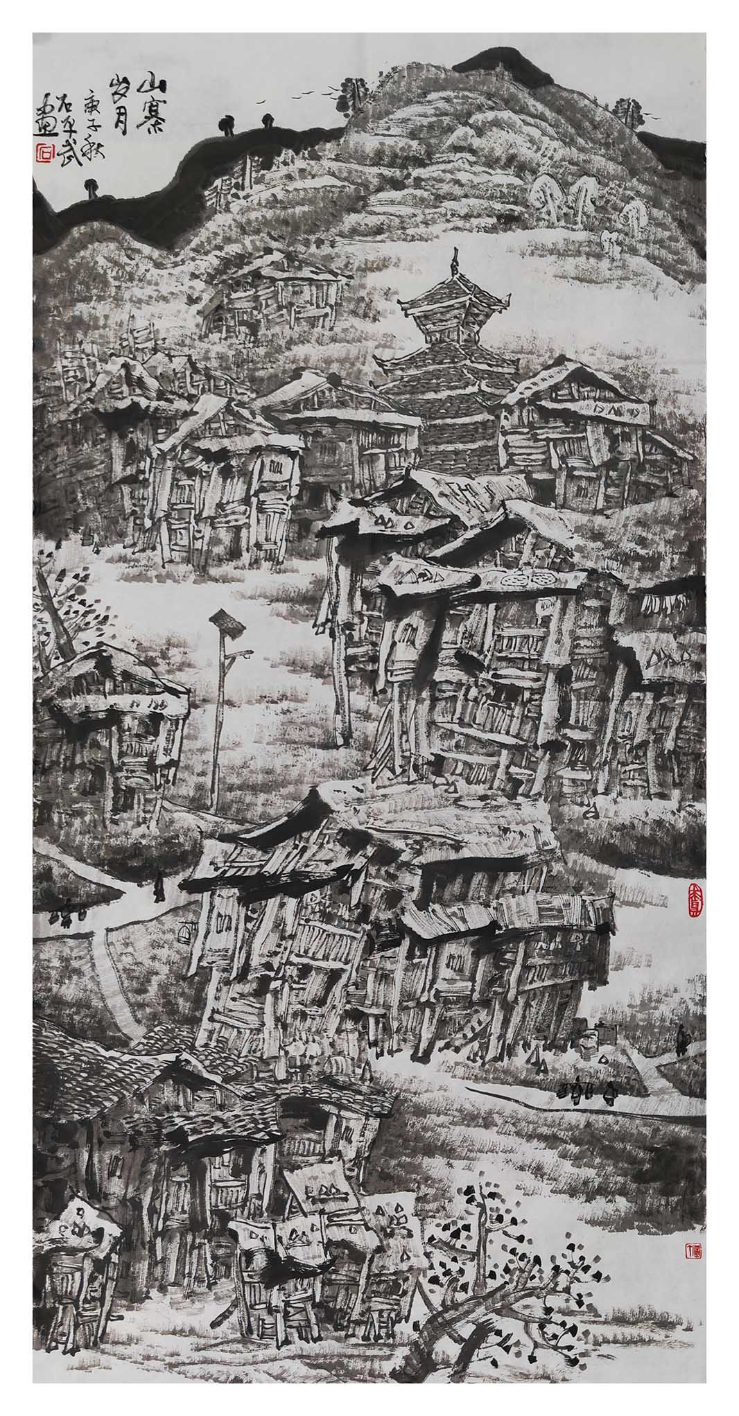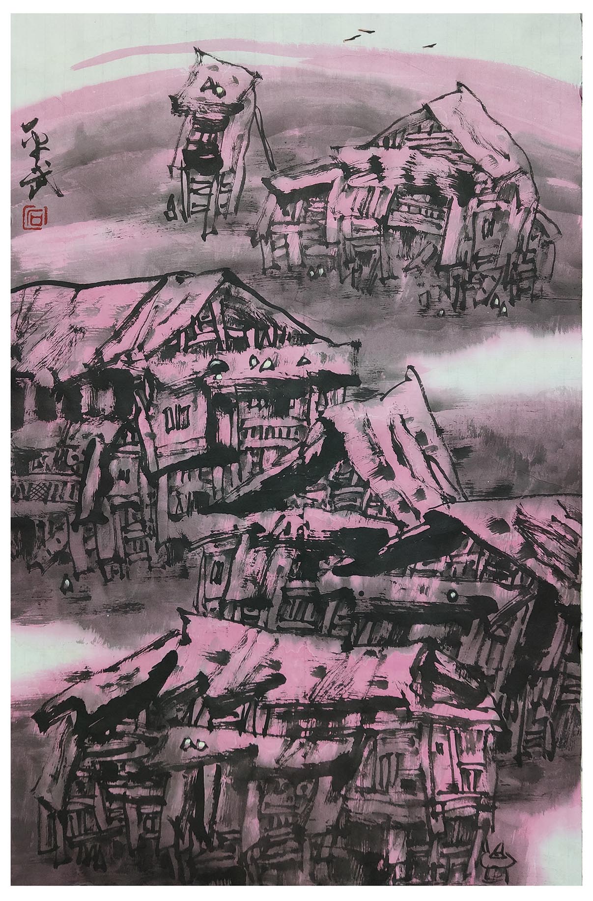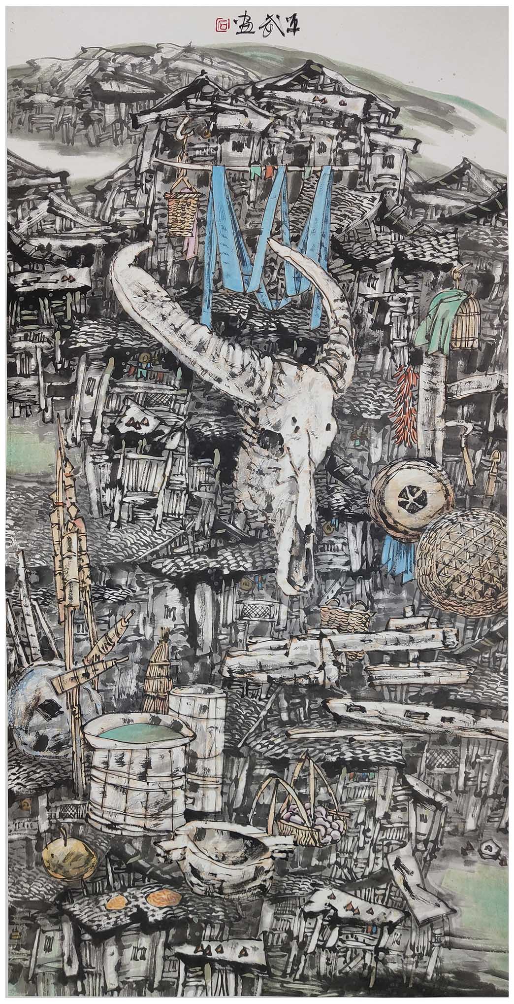 在漫长的丹青生涯中,石平武一直热衷于描绘历史悠久的苗乡侗寨,也喜欢描绘那些伴随着侗、苗民族走过悠悠千年的劳动工具和生活用具以及古老的图腾一一水牛头骨,表现一种原始、古朴、沧桑之美,表达着他对传统文明和逝去岁月的眷恋之情,抒发浓浓的乡愁,也讴歌了侗、苗民族的风骨与韧性。经过几十年的执着追求与探索,他创立并掌握了属于自己的绘画语言一一物象苍老、笔墨古拙、构图满实,具有与众不同的视觉冲击力。他笔下的老村老寨,神形兼备,意境苍凉,韵味十足。那一堆堆老房子,犹如一群群饱经风霜的百岁老人,蹲守在山山岭岭之上,见证着时光流逝。那些图腾和用具则是古老文明的象征。