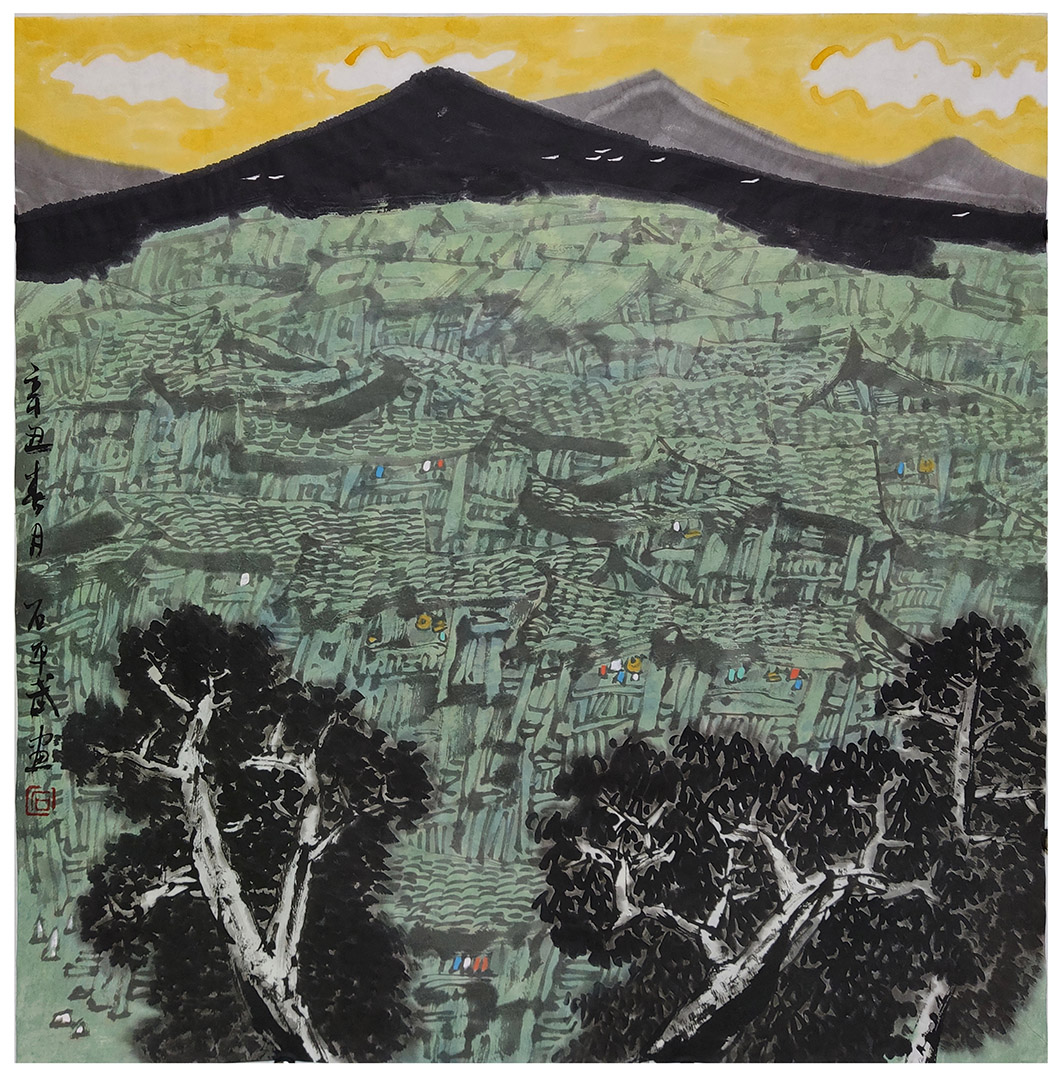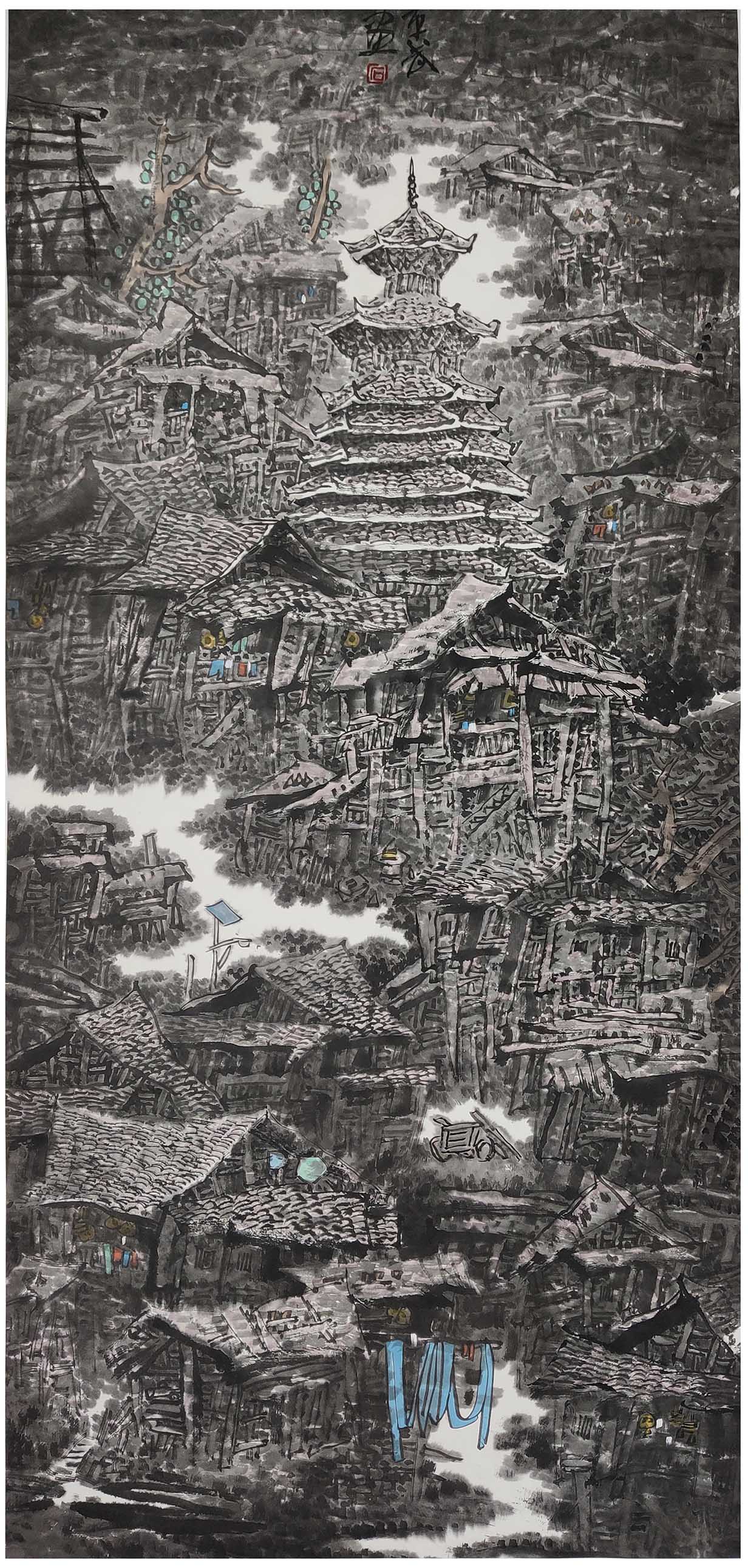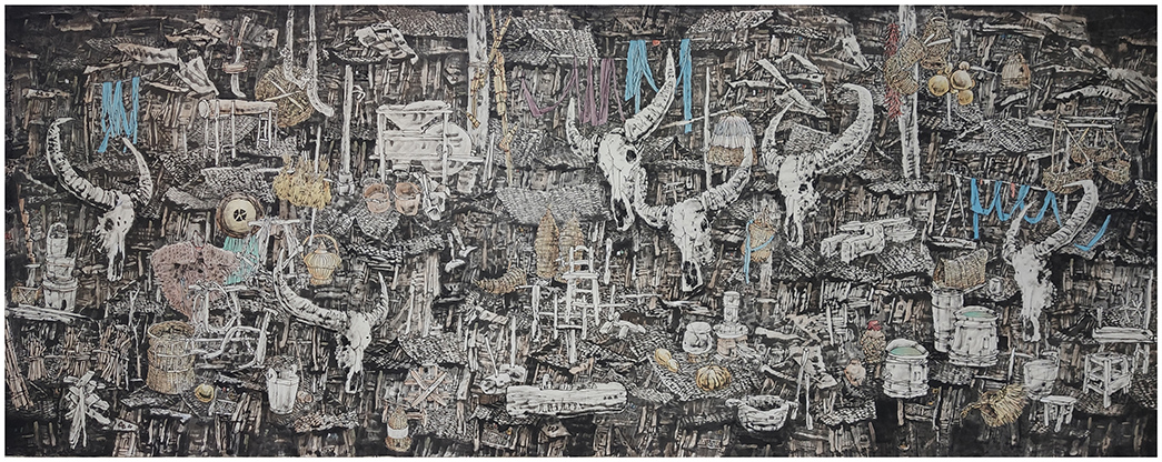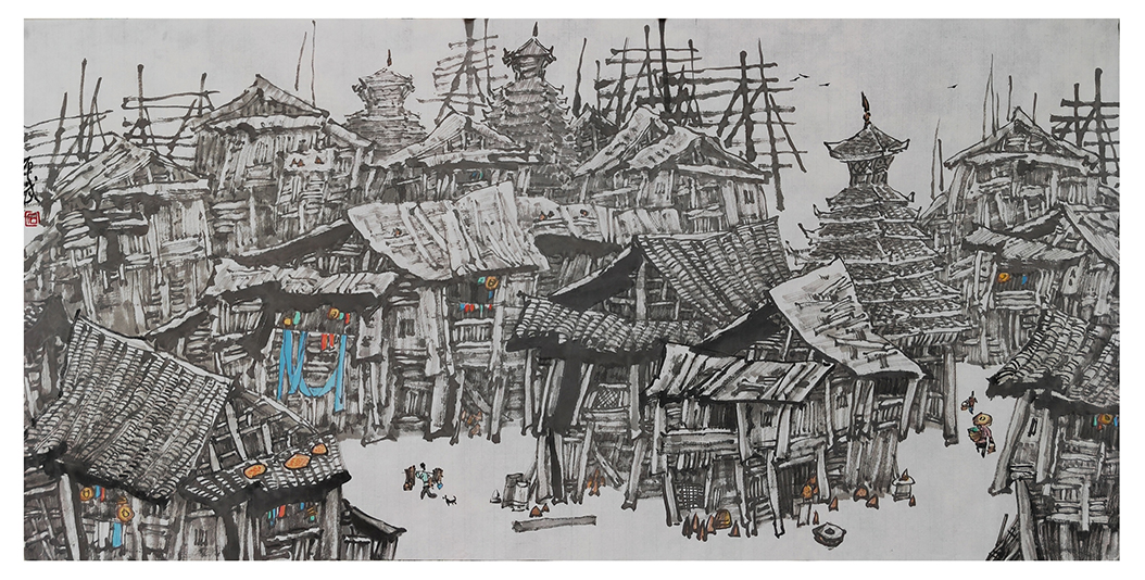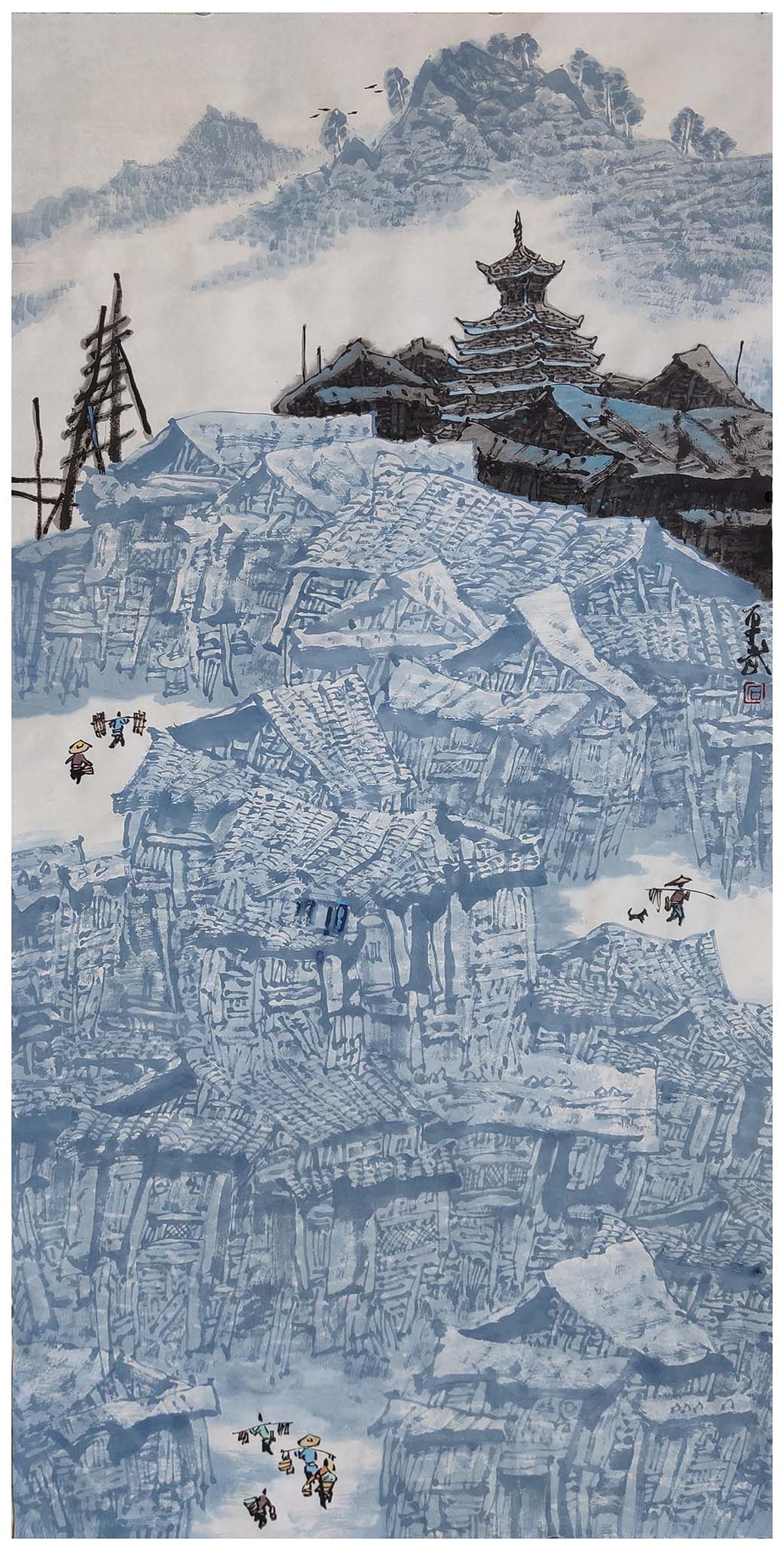 在漫长的丹青生涯中,石平武一直热衷于描绘历史悠久的苗乡侗寨,也喜欢描绘那些伴随着侗、苗民族走过悠悠千年的劳动工具和生活用具以及古老的图腾一一水牛头骨,表现一种原始、古朴、沧桑之美,表达着他对传统文明和逝去岁月的眷恋之情,抒发浓浓的乡愁,也讴歌了侗、苗民族的风骨与韧性。经过几十年的执着追求与探索,他创立并掌握了属于自己的绘画语言一一物象苍老、笔墨古拙、构图满实,具有与众不同的视觉冲击力。他笔下的老村老寨,神形兼备,意境苍凉,韵味十足。那一堆堆老房子,犹如一群群饱经风霜的百岁老人,蹲守在山山岭岭之上,见证着时光流逝。那些图腾和用具则是古老文明的象征。