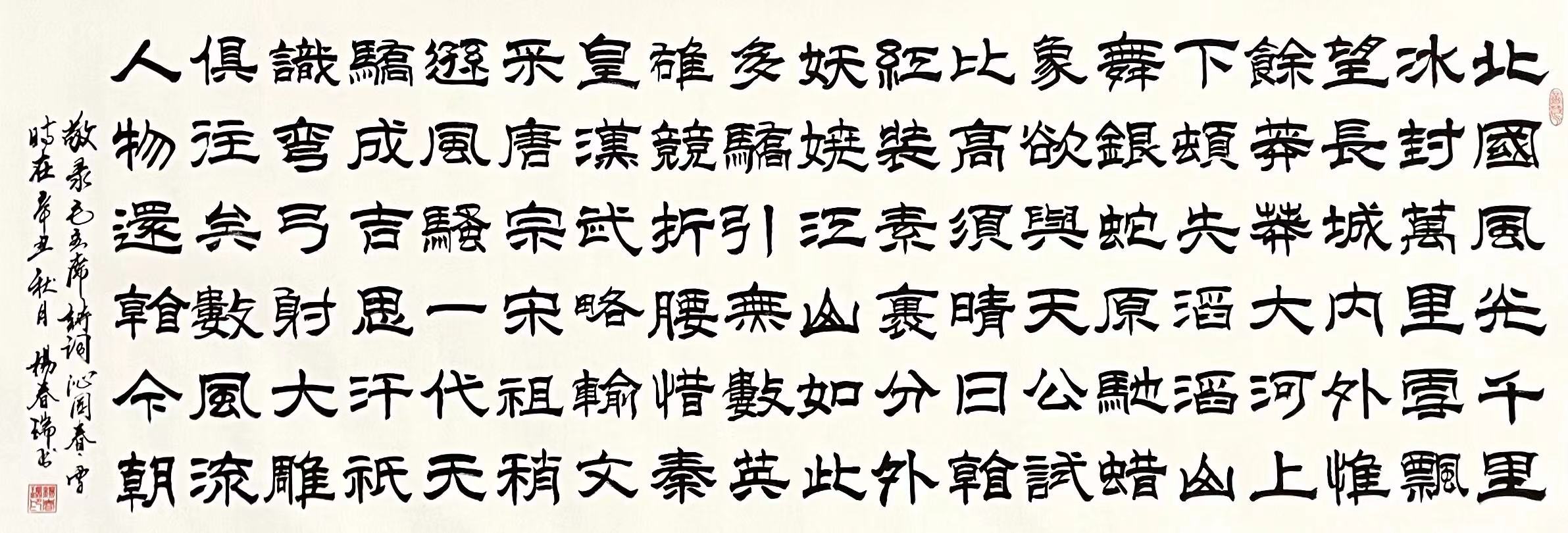 杨春瑞的个人作品多次参展县、地、省,及国家级文化部门的作品展获奖,并荣幸评为县、地、省级“文化先进个人”、“先进文化户”、出席省文化厅的表彰会,并和省文化厅、省委领导合影留念,省电台多次报道个人的艰辛奋斗历程,保定日报也刊登个人作品和报道县文联、县美协吸收为会员,县团委命名“自学成才标兵”,中国农民书画研究会吸收为会员,八九年毕业于中国书画函授大学。其本人荣获全国第二届,第三届“中国梦想杯”书画大赛金奖。自幼酷爱书画,勤习书画50余年,习古人碑帖,颜柳欧赵多家书体,临池不辍,取众家之长,归为己有,多次参加全国大赛获奖荣获“中国当代百名杰出书画家”、“新世纪百名书圣艺术家”称号。作品入编中国书法家作品集,中国当代书画名家大典,国之瑰宝书画名家辞典,中国当代书法楹联精品绮第四,五届中国当代书画名家精品拍卖图目等60余部选集,作品代表国家做为国礼赠送给国外友人。现为中国书法家协会会员,中国书画名家书画研究院名誉主席,东方艺术研究院终身艺术顾问,河北省美术协会一级画家,河北清雅堂书画院主席,清风艺术馆理事,万佳书画院名誉院长等职。作品经常在全国各地区展出,多次入选海内外书画大展,获金銀铜奖,作品被国内藏友或国外朋友收藏。汉字从图画、符号到创造、定型,由古文大篆到小篆,由篆而隶、楷、行、草,各种形体逐渐形成。在书写应用汉字的过程中,逐渐产生了世界各民族文字中独一的、可以独立门类的书法艺术。随着时代发展,书法艺术更是丰富多彩,其中最为擅长的篆书、隶书、楷书。