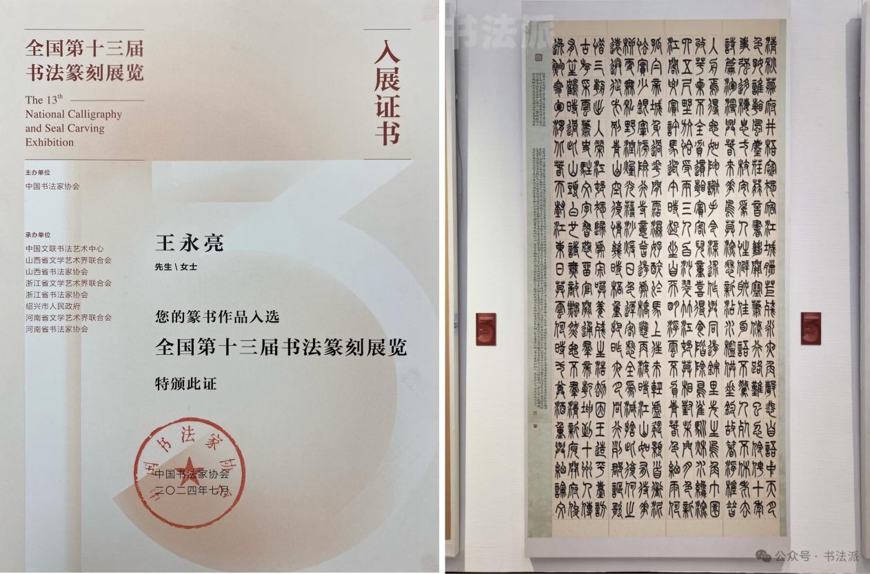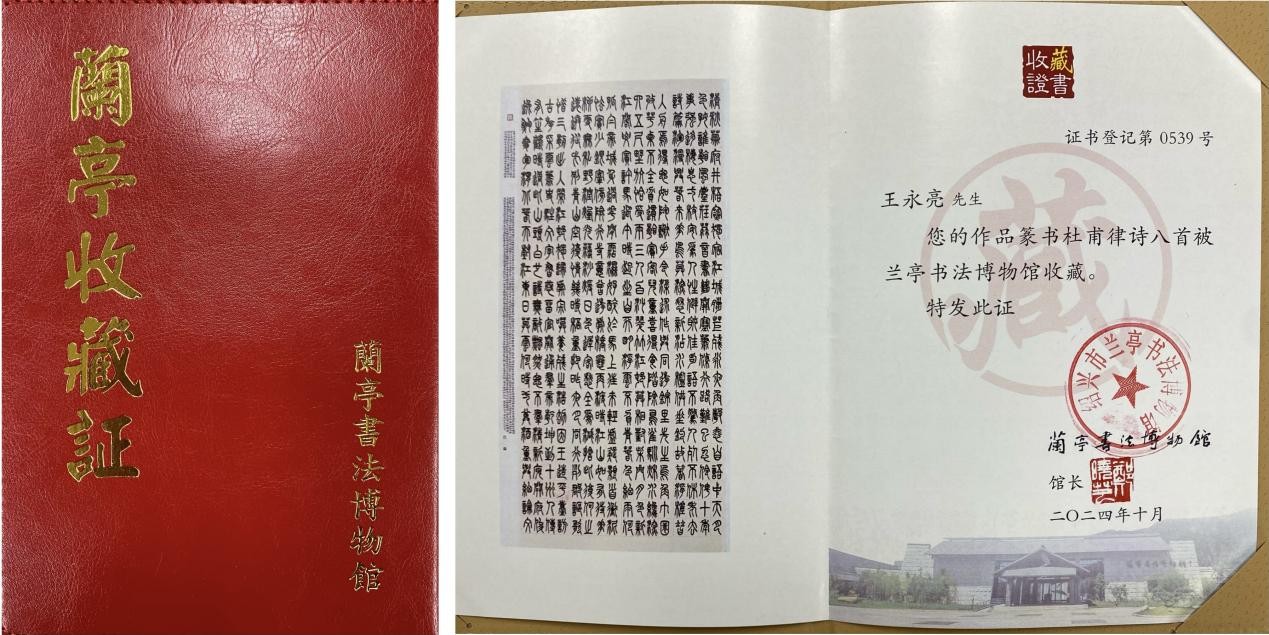 2023年小篆作品《杜甫律诗八首》全国第十三届书法篆刻展览入展,并被“兰亭书法博物馆”永久收藏。