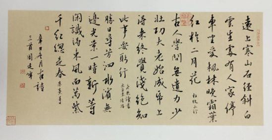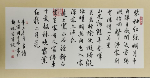 其小楷多取法钟繇、王宠笔意和姿态,结字追求茂密幽深、自然天成,无雕琢气,风格古朴,体势微扁,点画厚重,笔法清劲,醇古简静,富有一种自然朴质的意味,行气的调节多赖结构长短正侧之变化。传统功力浑厚,结体端庄完美,苍劲古拙,典雅醇厚,师古而不泥。行书以王羲之兰亭序和怀仁集王羲之圣教序为主。行草结合,刚柔兼容,飘逸清秀,气韵贯通,笔墨酣畅,笔势委婉含蓄,遒美健秀,点画疏密相间自成风貌。