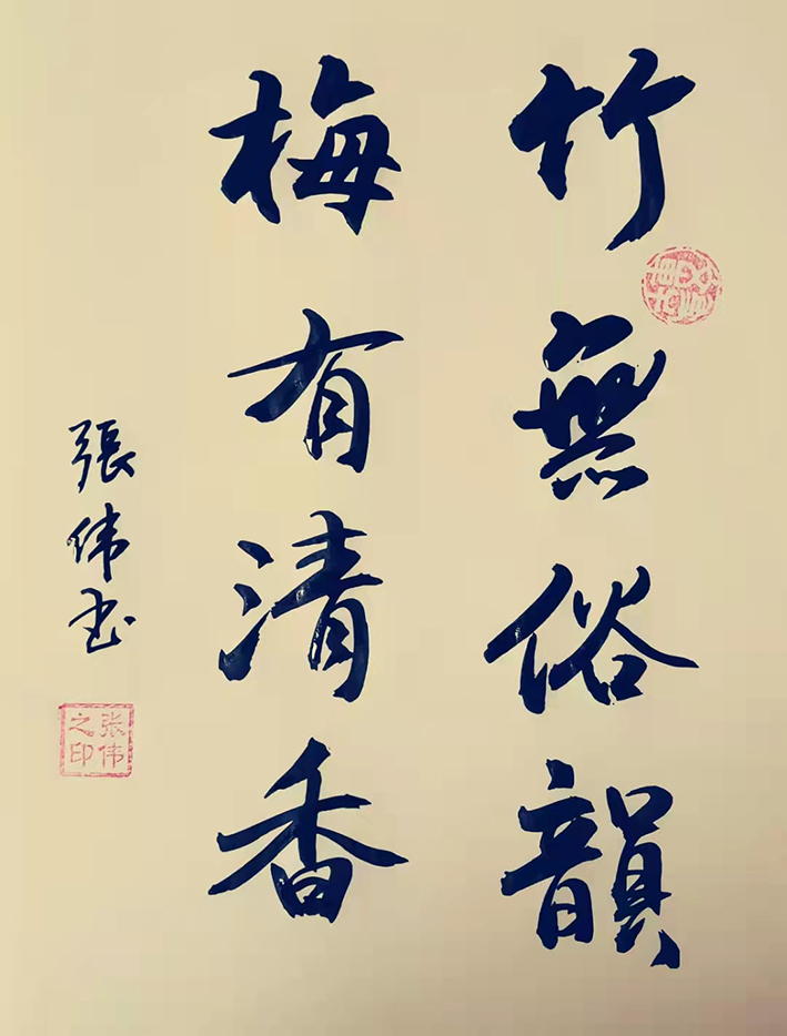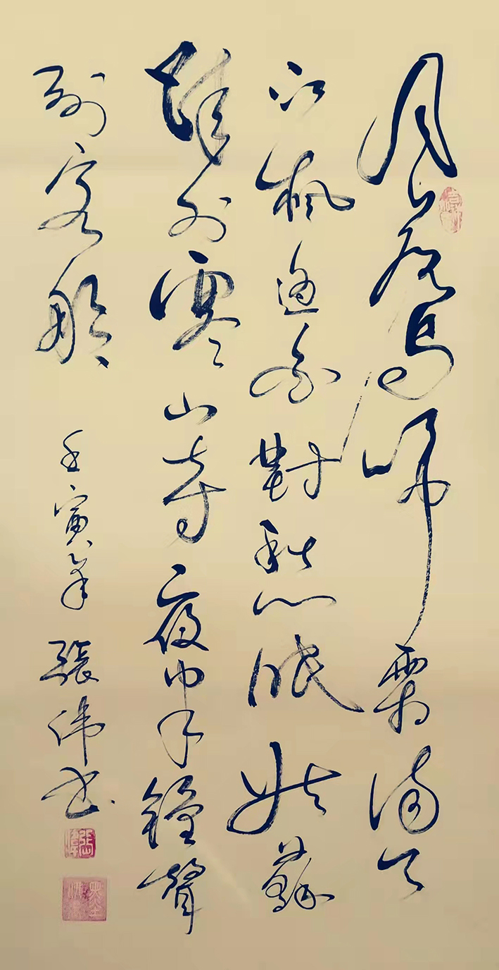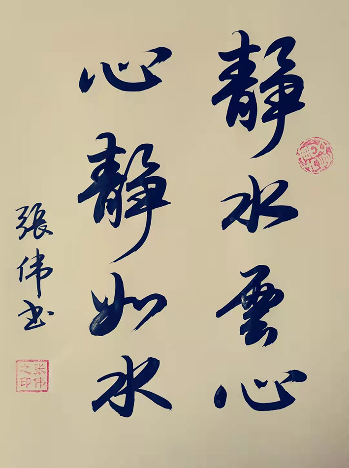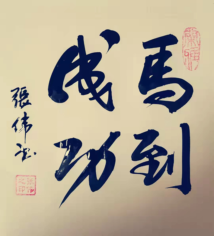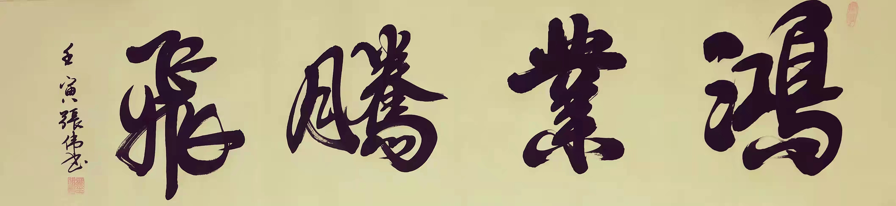 张伟先生的字风:主要以行楷、行草、草书为主,用笔沉稳,章法布局合理,外貌圆润而有力道,文化内涵丰富,磅礴气势,潇洒飘逸,线条优美,笔画之间牵丝映带。
