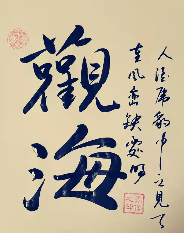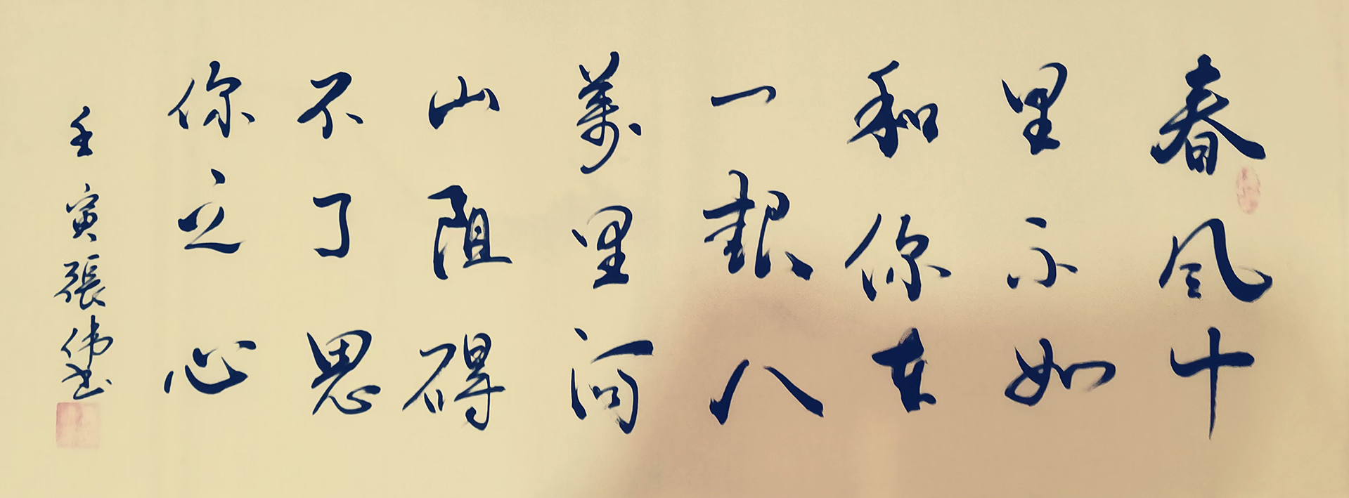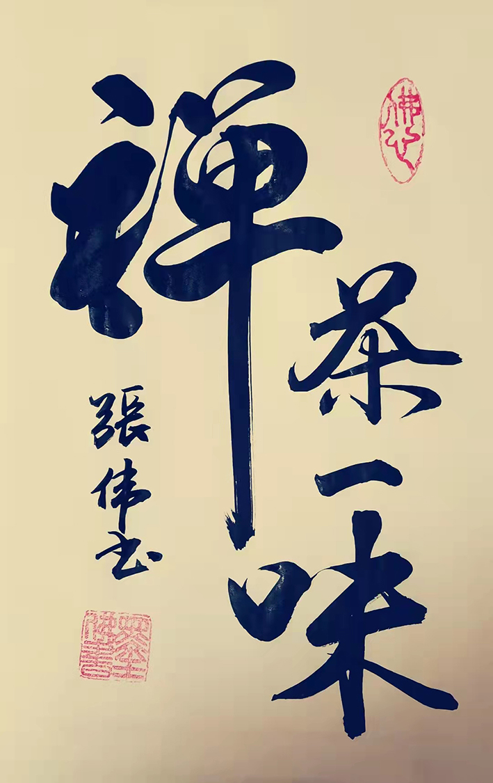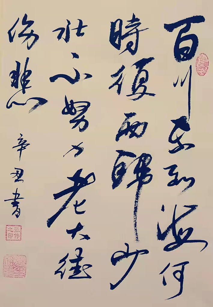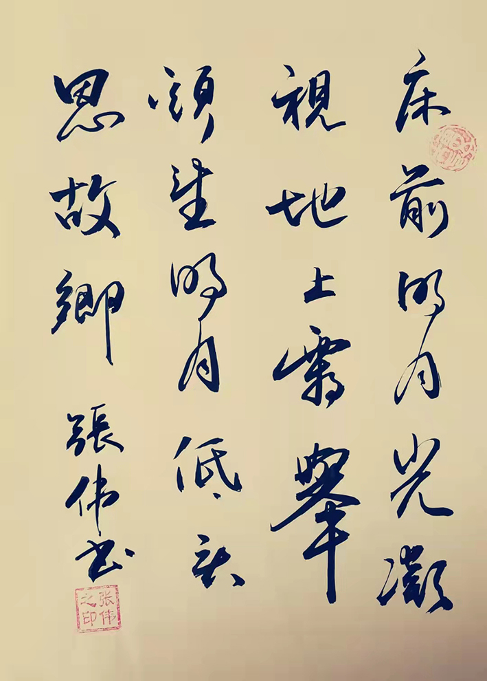 张伟先生的字风:主要以行楷、行草、草书为主,用笔沉稳,章法布局合理,外貌圆润而有力道,文化内涵丰富,磅礴气势,潇洒飘逸,线条优美,笔画之间牵丝映带。