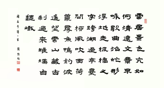 最能反映砚超的书法艺术境界的是他的隶楷,他将楷书的笔法、隶书的笔势、篆书的笔意融进隶楷,自成一体,别具一格。其点画似隶似楷,亦行亦草,长横和竖钩都呈隶书笔形,而撇捺的笔姿又常常近于魏碑,分外苍劲、灵秀。古拙淡雅,有一种真率天成的韵味和意境,令人爱不释手。