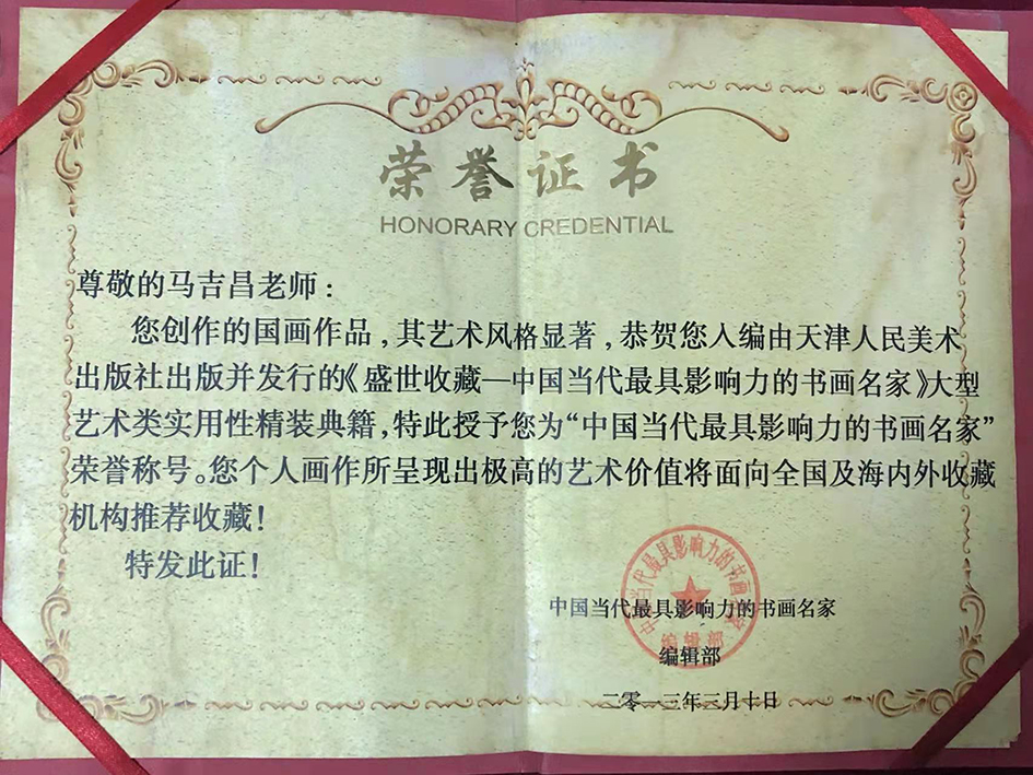 马吉昌,亦署大吉 ,天印轩主,1959年出生于河北邯郸,中国艺术家,中国书画艺术委员会主席,当代最具影响力的书画名家,国家一级美术师,金奖艺术家,《百年百家》画家,赵文化研究会副会长,儒道释学术研究会会长,荣宝斋特邀高端书画学术名家,中国新加坡马来西亚文化特使,中国国际书画高级研究员,中国民建艺专委客座教授,中华国礼艺术家,书画大师。