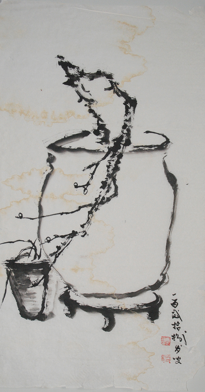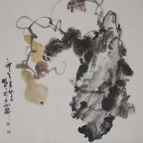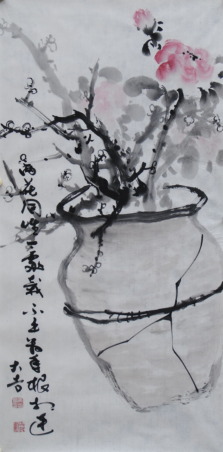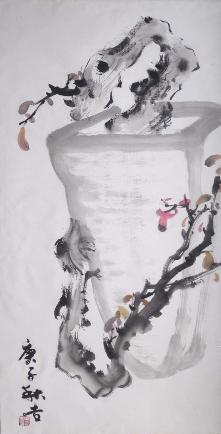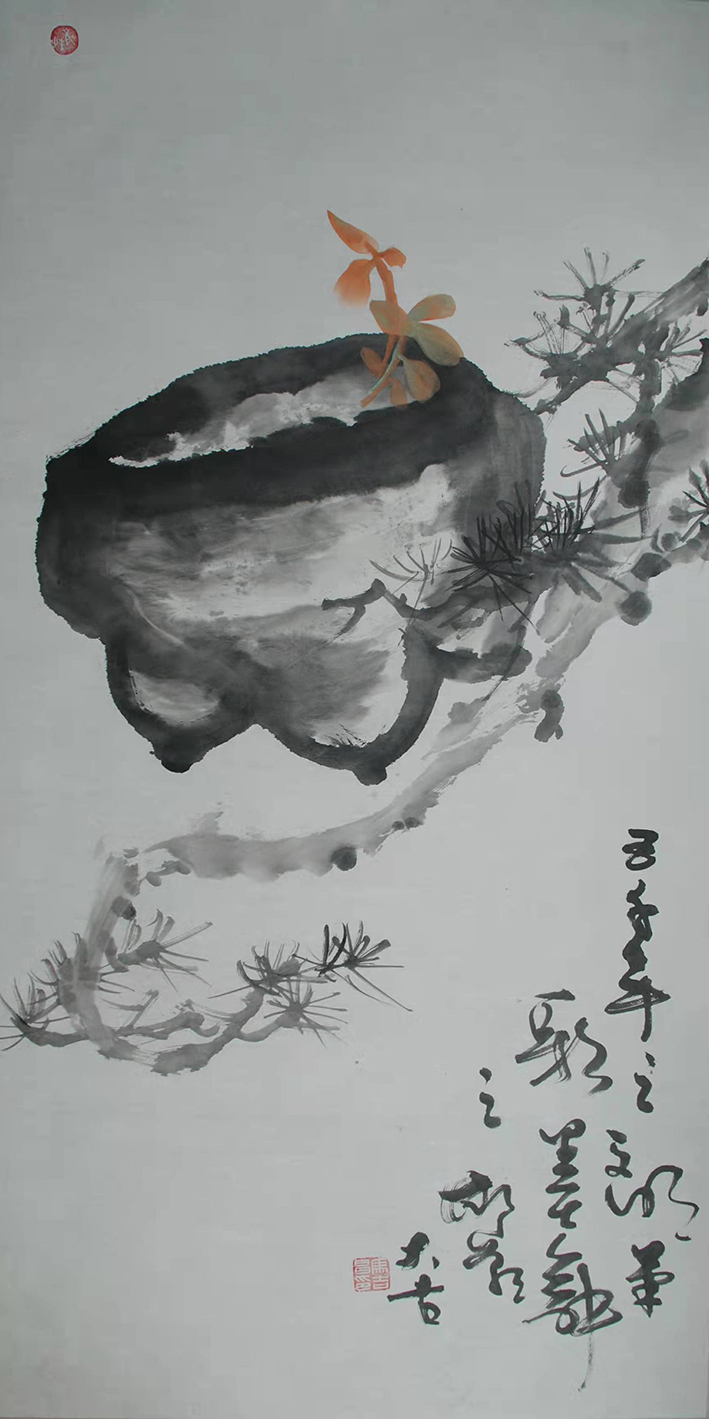 八大山人画独鸟,或是独鱼,白眼外翻,怪而僻的冷峻里,用极为简约的笔墨手法,去酝酿心中的万万千千。当代马吉昌的大写意花鸟,也以画“独”为形态塑造,但是“独”的选题,不是鸟,也不是鱼,而是一瓶或是一篮,一山或是一枝,往往是随手撷取一物,就是画题的万般精彩。