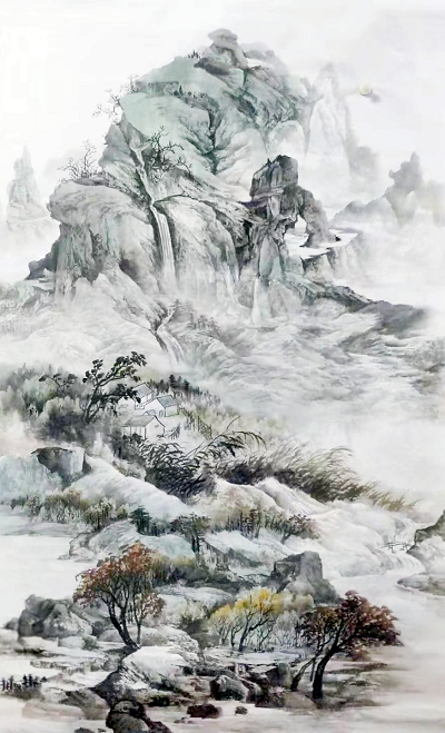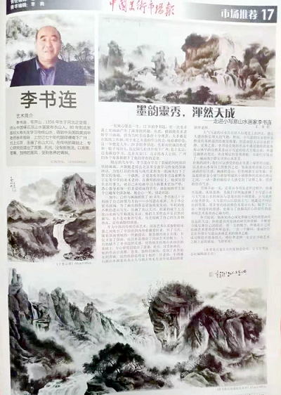 李书连的先生的作品有点像是在讲述着北方的故事,也把李可染先生、陆俨少先生、叶浅予先生对他的悉心指导挂在嘴边上,孰不知他自己的创作理念和风格已经逐步成型,创作风格已经独树一帜。他坚持着自己的中国画精神取向,坚信通过用创造性的语言和对超越存在的生命形象选择可以赋予自己的画作以崭新的生命力。李书连多年来致力于继承和探索北方山水画的精髓,在传统和创新的交汇中走一条自己的路。他的山水画恢弘大气,意境深远,雄劲苍茫,着力表现北方山水的奇峻风光。他借鉴运用多种绘画语言, 将具有时代感的大自然的美寓于传统的笔墨构架中。作品正大而典雅,壮美而和谐,以其独特的格调和没骨的技法,彰显北派山水新的风貌。