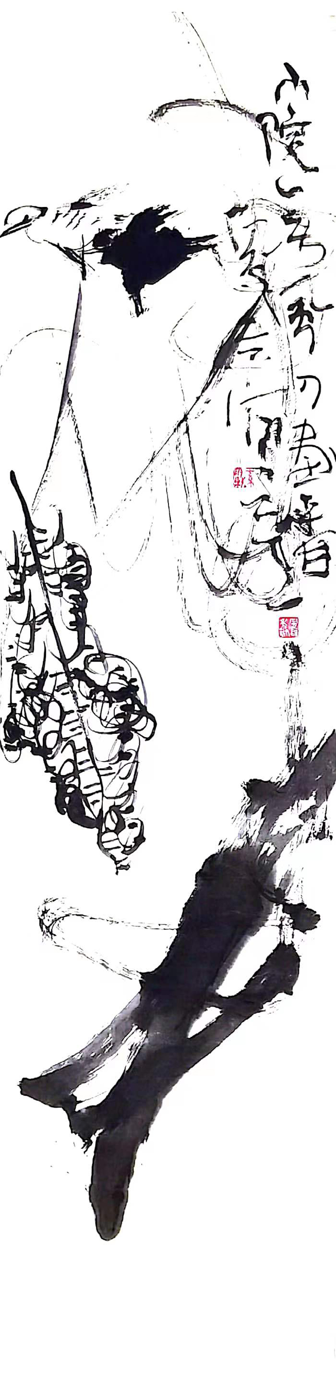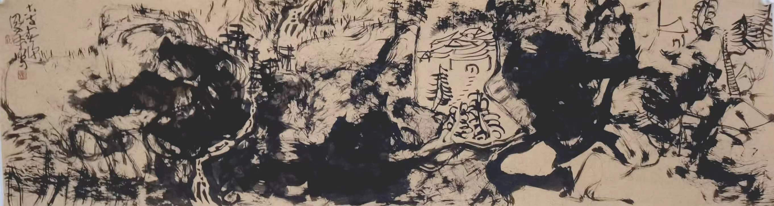 王凤年先生山水画的另一艺术特色是对墨法的运用。将《书谱》中的“带燥方润,将浓遂枯”的书法用笔融会到他的大写意山水画中,借助书法的用笔与墨色细微而丰富的变化,来宣泄情感。他常用浓墨挥毫,由浓及淡,而至虚白,特别注意虚实相生,计白当黑,他的作品不仅仅呈现在“墨分五彩”的视觉对比范围里,而是作为一种情绪色彩融合在作品的整体情感之中,将渍墨、浓墨、淡墨与飞白巧妙结合,一隐一显、一涨一缩、一枯一润,营造出一种华彩飞扬而深邃厚重的生动气象。
