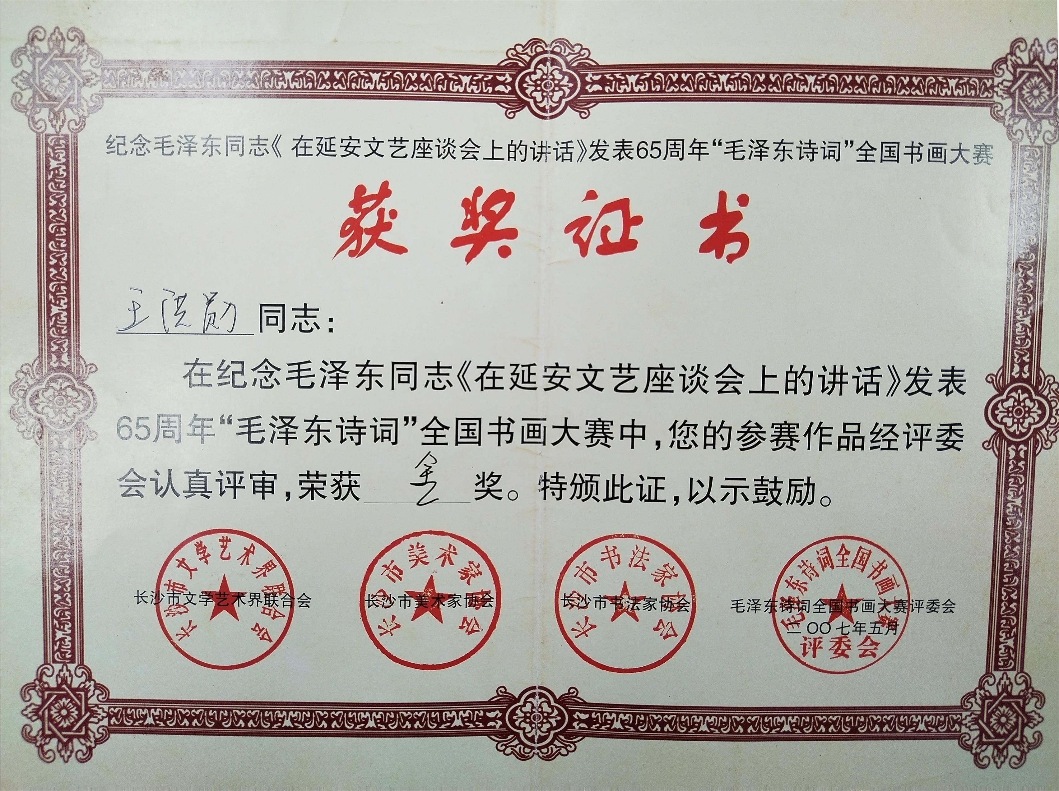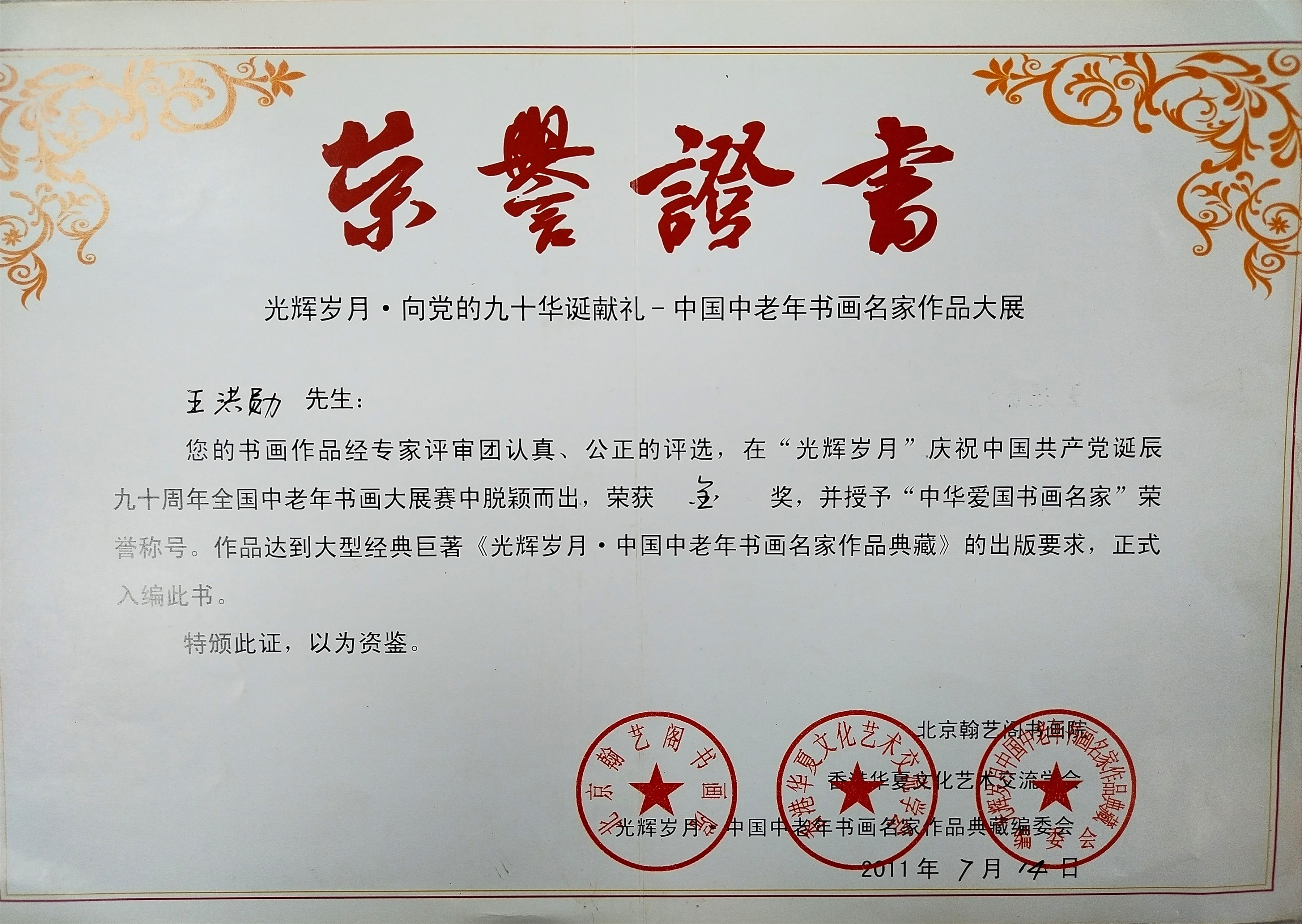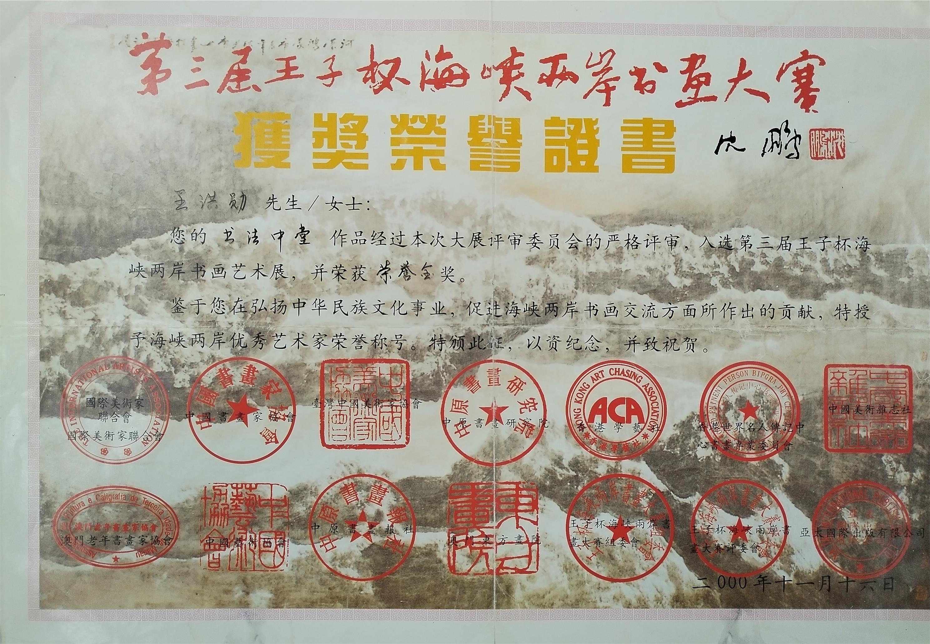 作品在第五届国际书画作品展览荣获金奖,第二届“王子杯”海峡两岸书画大赛金奖,获国际书画艺术名认证资格证书,作品入编《现代青年书画家名人录》、《海峡两岸书画名人大辞典》、《中国国际书画篆刻家年鉴》、《中华颂全